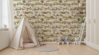 Bring the charm of a storybook forest to your home with this delightful wallpaper by Uta Naumann. This design shows cute watercolour animals having fun in a green and beige woodland setting. It features a deer, bunny, fox, and bear along with trees, flowers, and other natural elements, all in a soft palette. This wallpaper for walls is perfect for a nursery, kids' room, or playroom. The watercolour style and cute animal characters create a peaceful and joyful atmosphere. This design makes interiors feel cosy, calm and imaginative. It creates a space where children can feel like they are visiting a fairy tale.