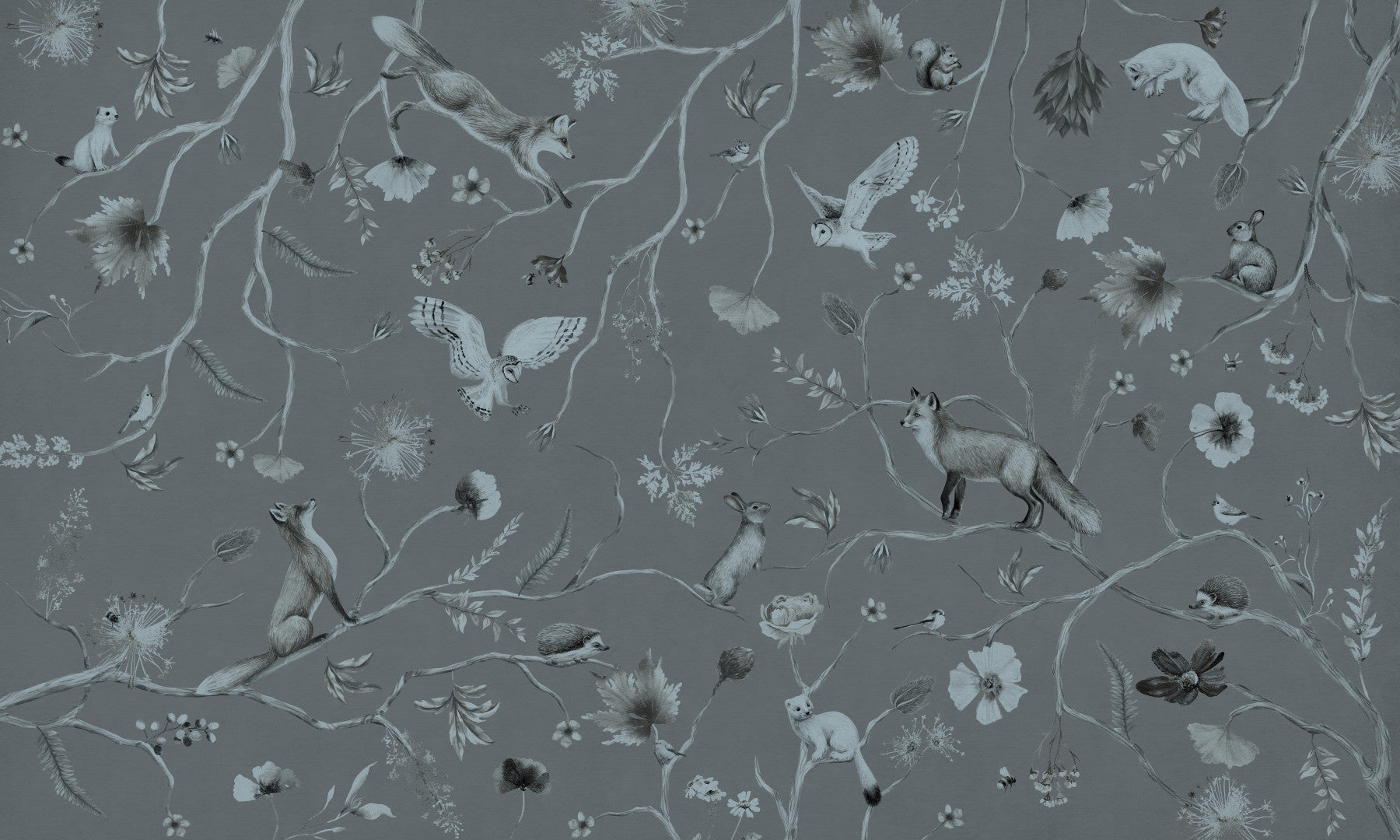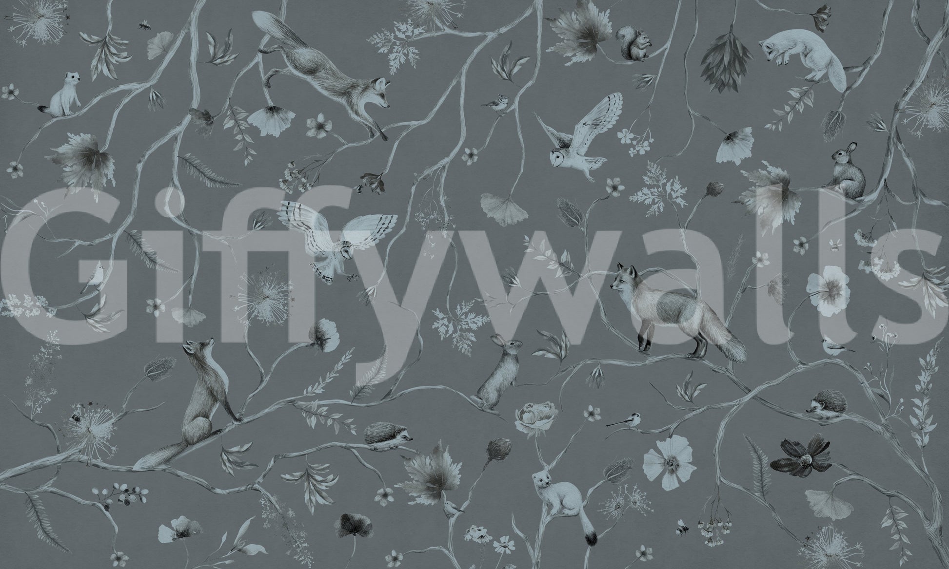 Invite nature indoors with this tranquil grey woodland design. The detailed illustration features foxes, owls, and squirrels among blossoming branches. This wallpaper for walls gives a sophisticated touch to living rooms, bedrooms, or nurseries. The muted colour palette creates a serene and calming ambiance, easily complementing many interior styles. Transform any space into an enchanting woodland retreat with this soothing and stylish print.