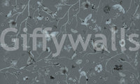 Elegant wall mural with whimsical woodland elements in gray shades