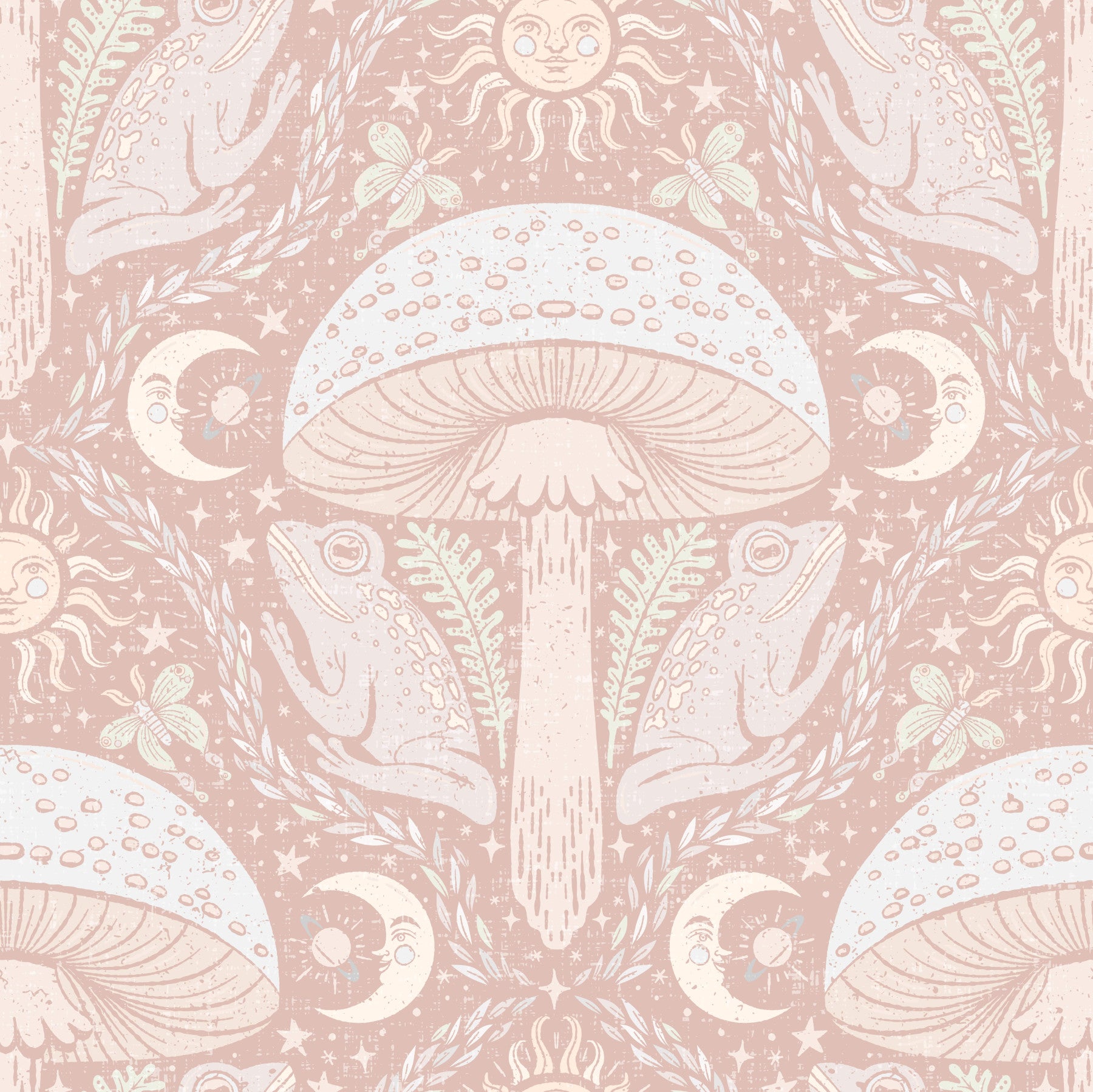 Embrace whimsical darkness with 'Whimsigothic Toadstools Ayara Pastel-01'. This enchanting wallpaper features a dreamy pastel palette, blending soft pinks and creams with intricate illustrations of toadstools, celestial bodies, and serene frogs. The design evokes a gothic fairytale aesthetic, with its detailed line art and charmingly eerie elements. Moons and suns share the space with delicate foliage and whimsical butterflies, creating a captivating, otherworldly scene that's both playful and sophisticated. Perfect for adding a touch of magical mystery to your digital space.
