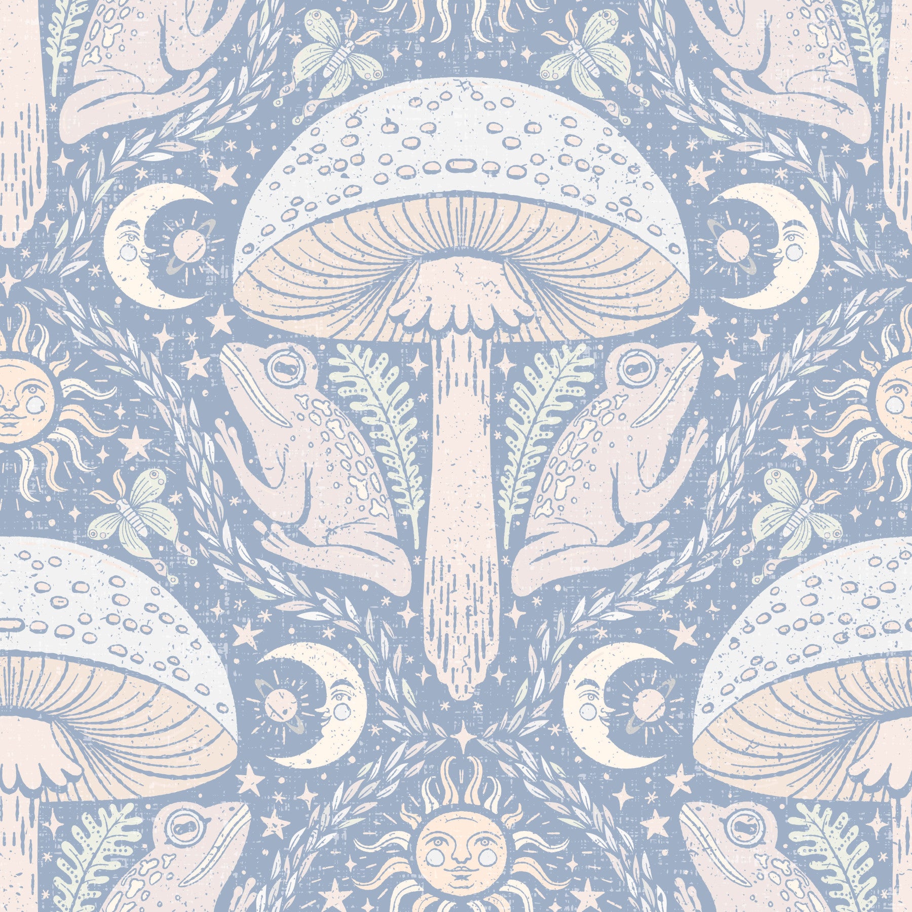 Embrace the enchanting allure of 'Whimsigothic Toadstools Ayara Pastel-02'. This whimsical wallpaper transports you to a dreamy, pastel-hued dreamscape where charming frogs gaze upon majestic toadstools under a celestial sky. Delicate butterflies flutter amidst a tapestry of stars, moons, and suns, creating a captivating blend of gothic and fairytale aesthetics. The soft, muted color palette and textured background add depth and a touch of vintage charm, making this wallpaper a perfect addition to any space seeking a unique and captivating atmosphere. A delightful fusion of fantasy and darkness, it whispers secrets of enchanted forests and mystical nights.