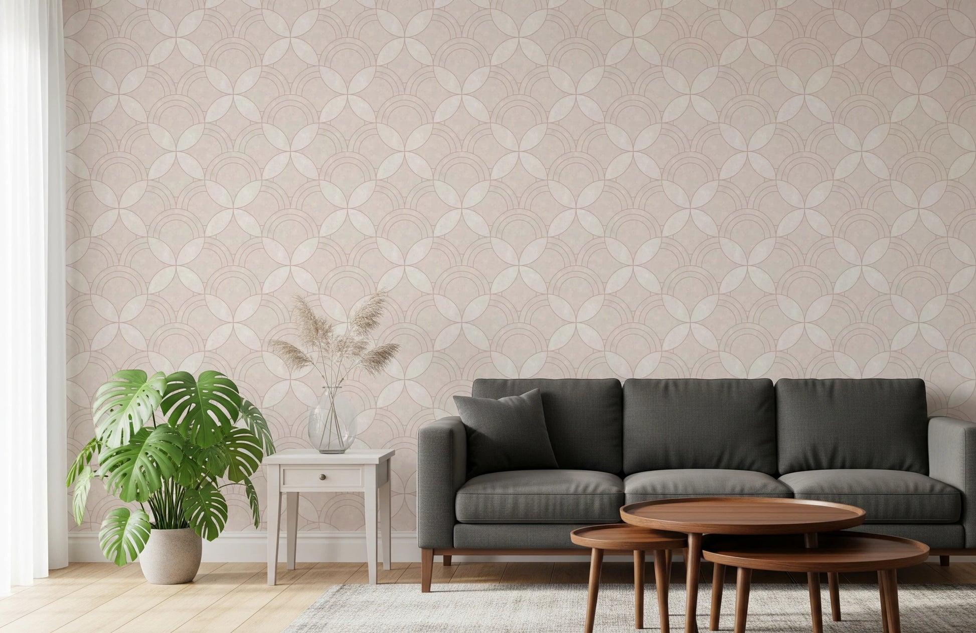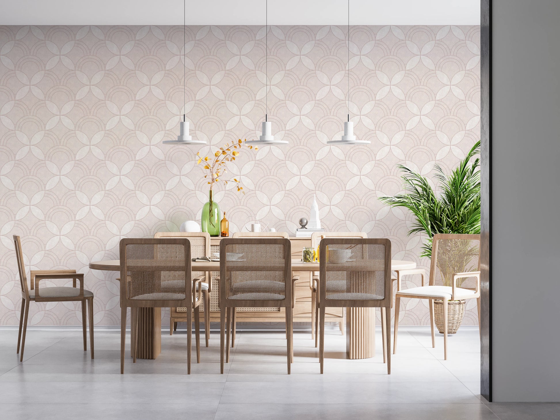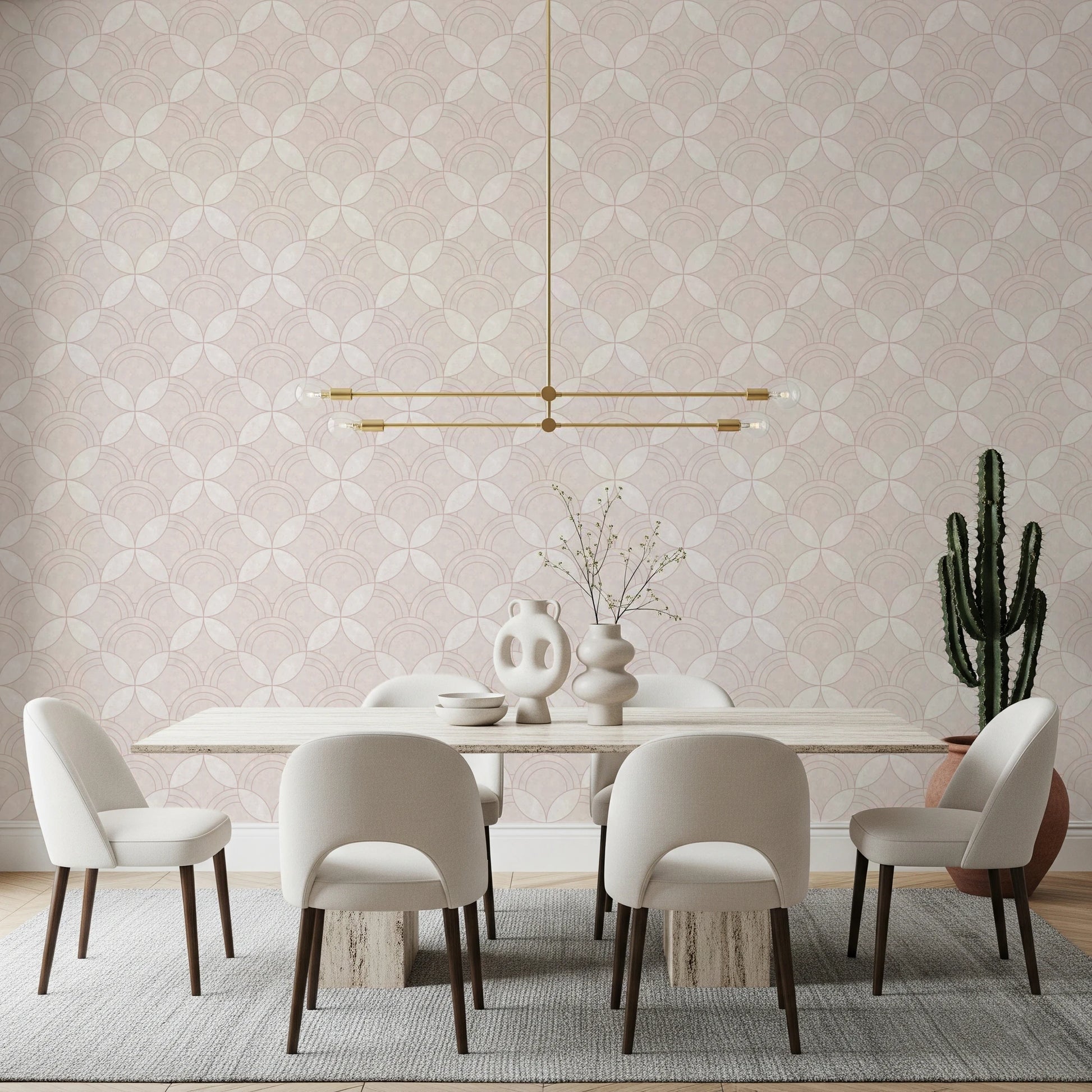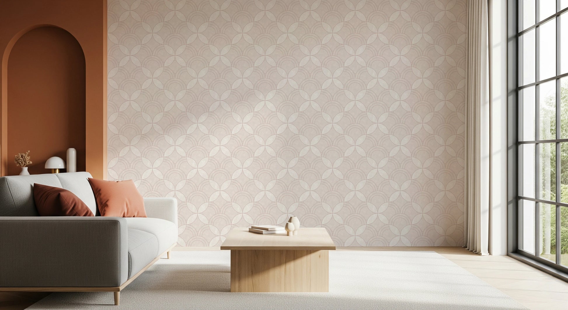 Transform your interior with the graceful simplicity of this geometric wallpaper for walls. Arcs interlock to create a visually engaging, repeating design. The wallpaper’s quiet pattern and warm, off-white palette provide a serene backdrop for any space, while its tactile texture enhances its subtle charm. Install it in your living room, bedroom, or dining area. This wallpaper adds a layer of visual depth, harmonises with existing decor, and creates an inviting atmosphere. Its versatile style works perfectly in modern spaces or classic interiors.