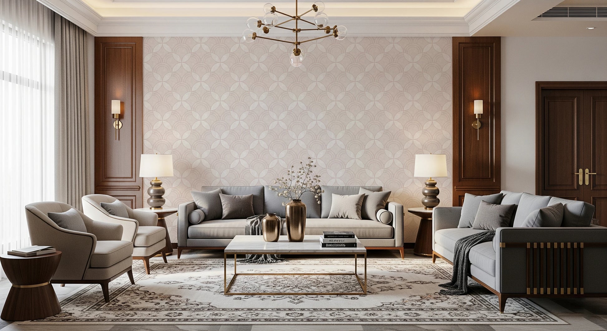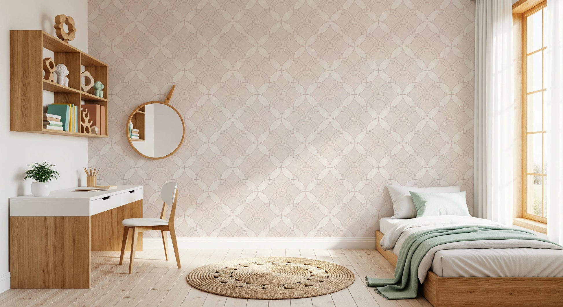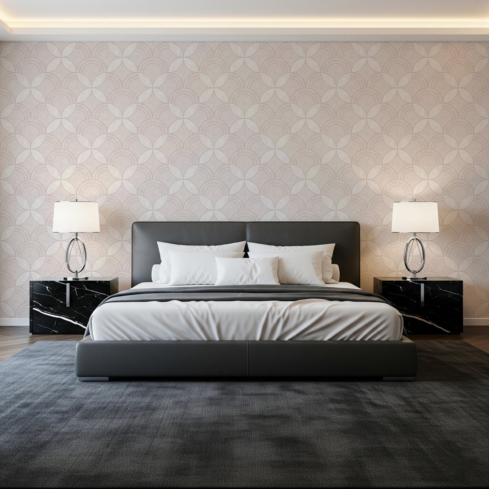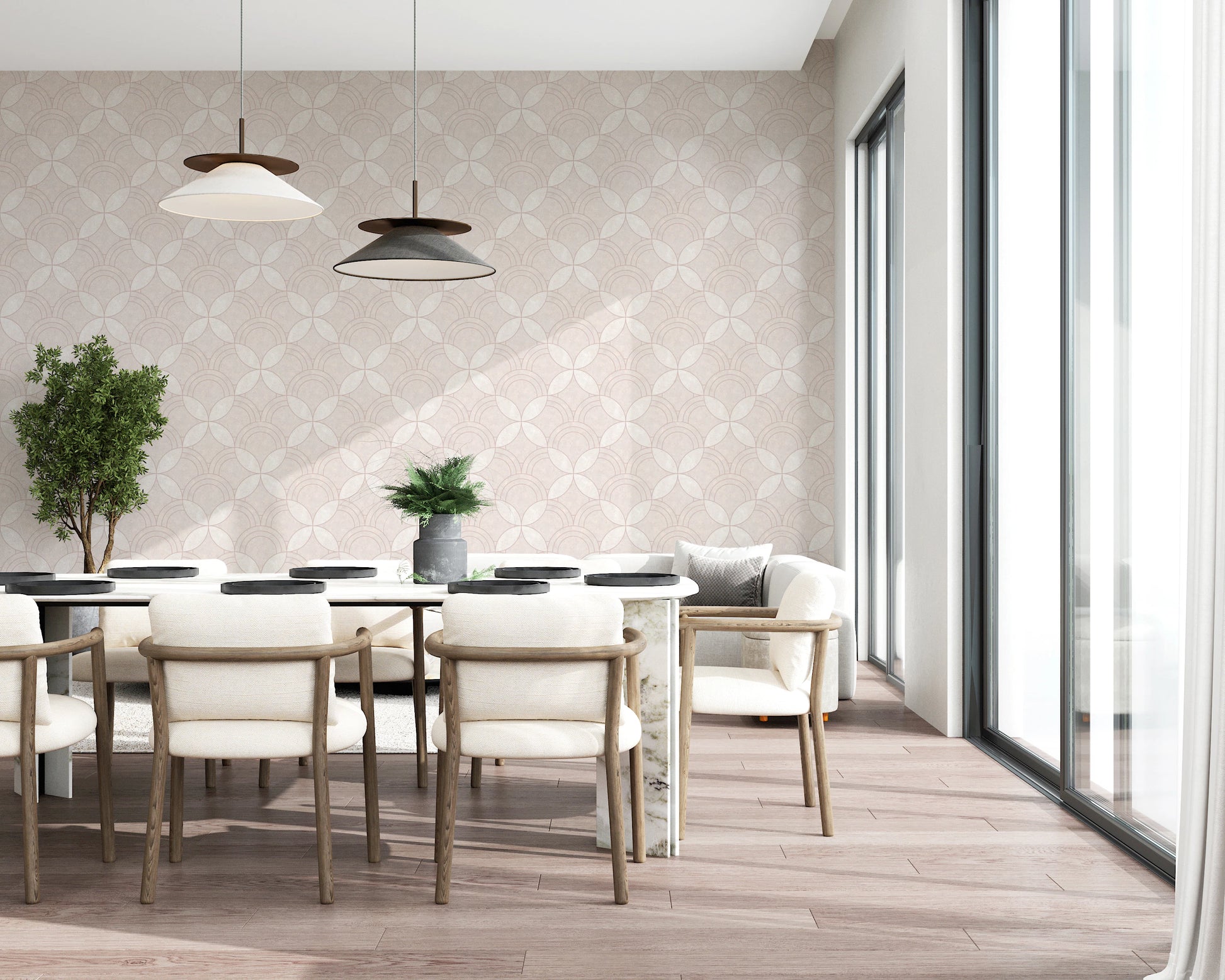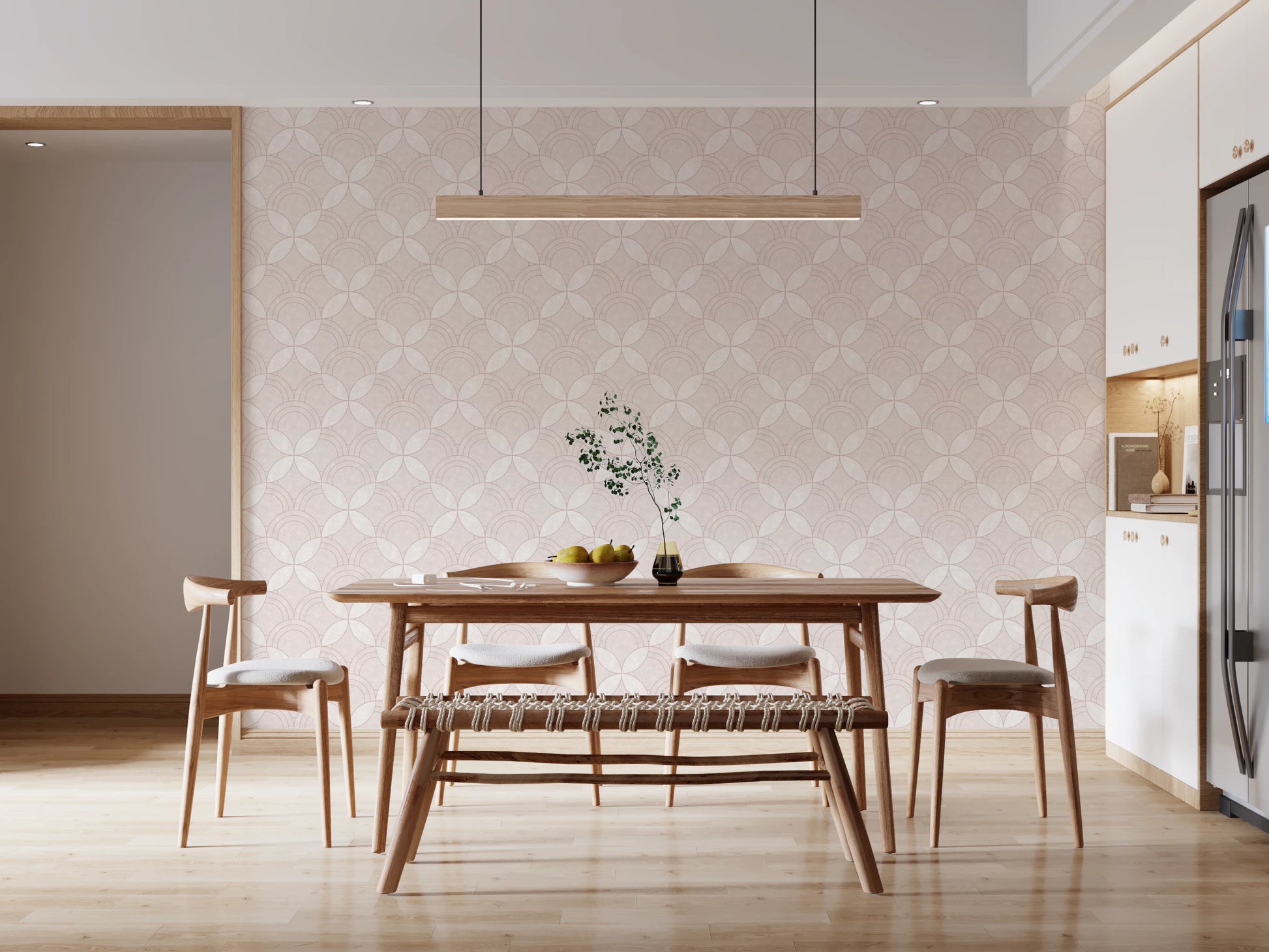 Transform your interior with the graceful simplicity of this geometric wallpaper for walls. Arcs interlock to create a visually engaging, repeating design. The wallpaper’s quiet pattern and warm, off-white palette provide a serene backdrop for any space, while its tactile texture enhances its subtle charm. Install it in your living room, bedroom, or dining area. This wallpaper adds a layer of visual depth, harmonises with existing decor, and creates an inviting atmosphere. Its versatile style works perfectly in modern spaces or classic interiors.