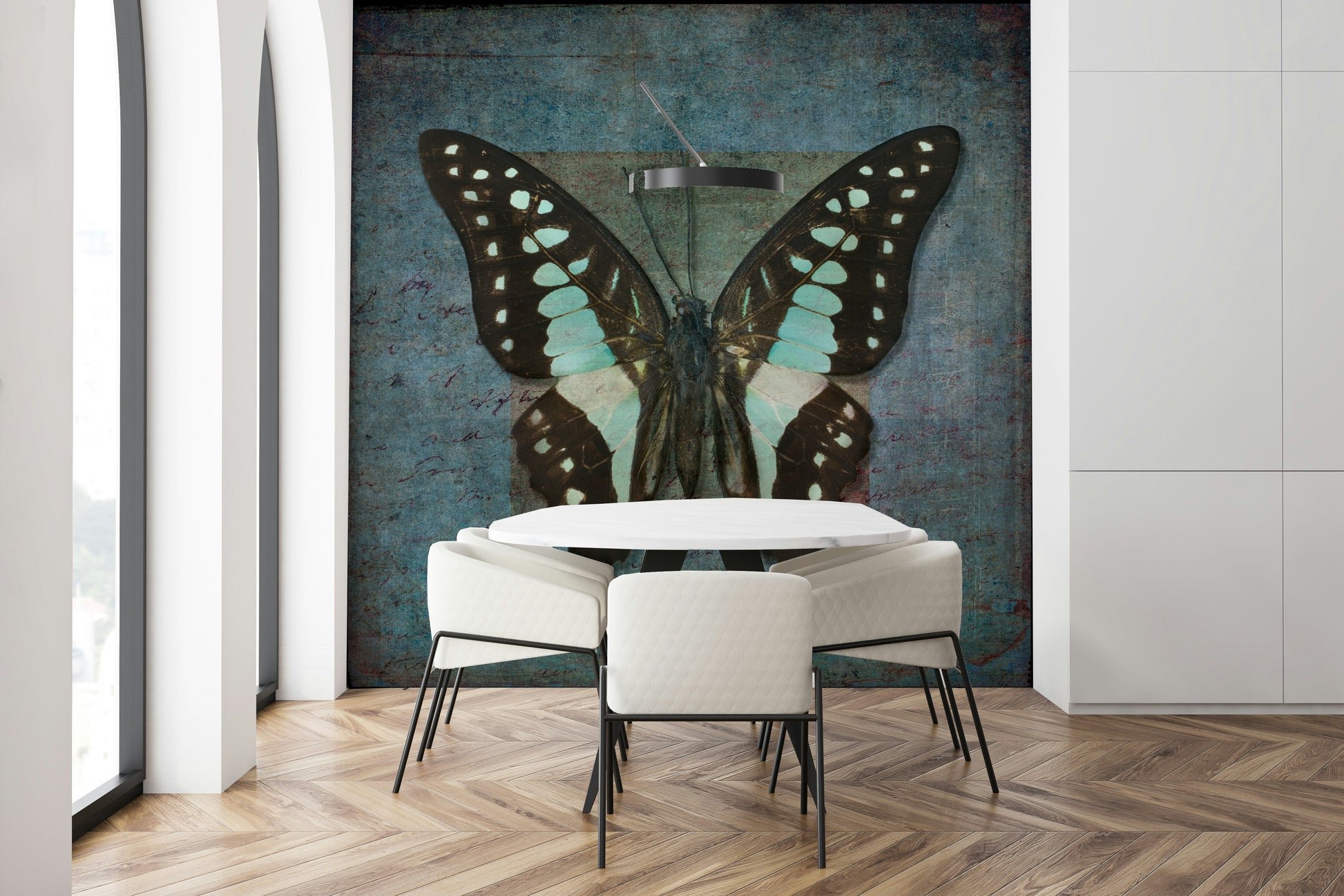 Colourful tropical Butterfly with vintage effects. Invite a touch of enigmatic beauty into your space with "Whispering Butterfly Aura." This wall décor piece presents a mesmerising butterfly, its wings a delicate dance of midnight black and serene aqua, poised against a textured backdrop that evokes the feel of aged parchment. Faint whispers of script fade into the teal canvas, hinting at hidden stories and bygone eras. The butterfly, a symbol of transformation and ethereal grace, casts a subtle aura, bringing a sense of tranquil mystery to any room. Its presence isn’t bold or loud, but rather a soft, calming influence, encouraging reflection and peaceful contemplation. This unique piece transforms any wall into a statement of subtle sophistication.