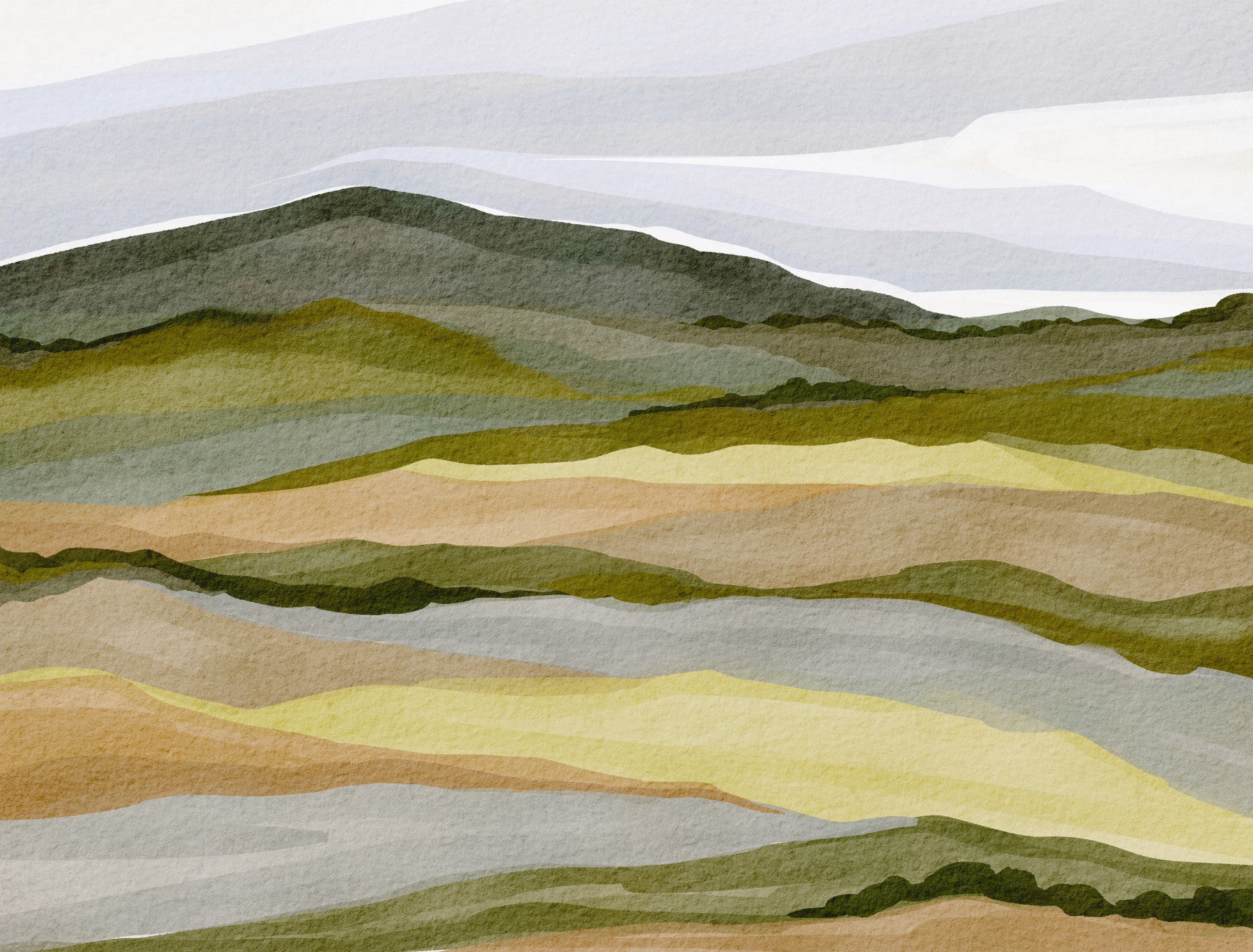 Experience the tranquil beauty of nature with this abstract watercolor landscape wallpaper. The image depicts a series of gently sloping hills and mountains rendered in soft, muted greens, browns, and grays. The artistic brushstrokes add texture and depth, creating a sense of serenity and calm. The overall mood is peaceful and contemplative, making it a perfect choice for spaces where you want to relax and unwind. Its understated elegance complements a range of interior styles, bringing a touch of the outdoors in.