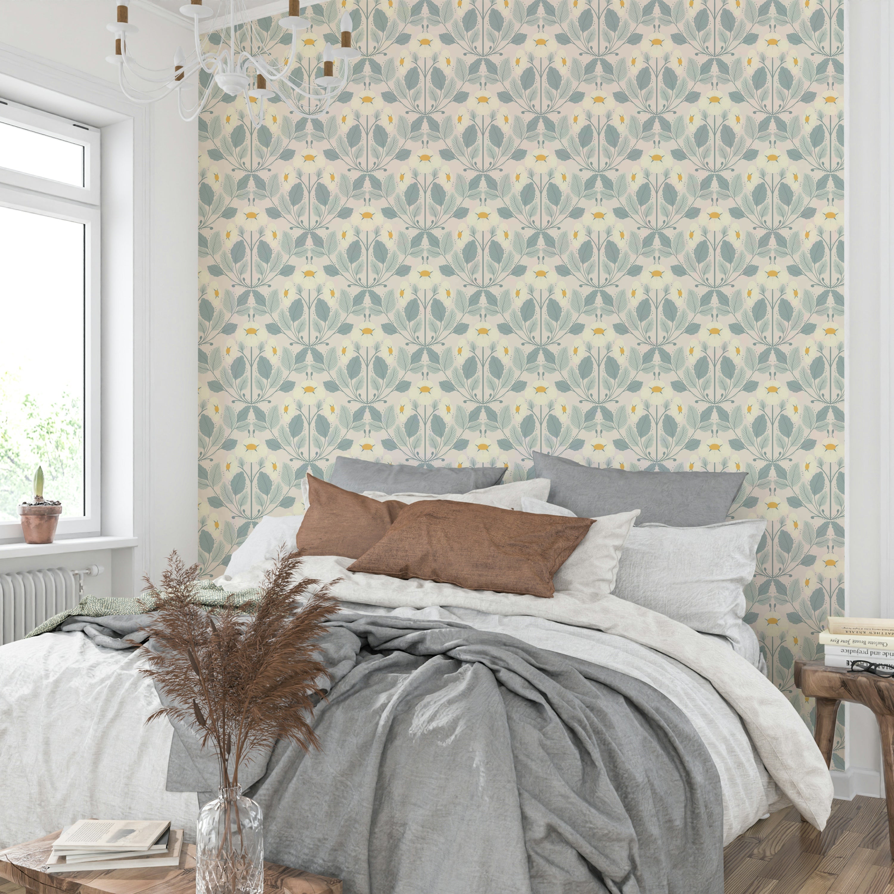 Add a folk-inspired charm to your walls with Strawberry Folk – Blush Cream wallpaper. This playful pattern combines creamy florals, soft teal leaves, and subtle dotted accents on a warm blush background. The symmetrical layout and vintage touch make it ideal for kitchens, playrooms, or cozy reading corners. Its stylized floral design gives a handcrafted look, perfect for adding character without overwhelming the room. This wallpaper for walls offers a cheerful, nostalgic vibe that pairs well with rustic or Scandinavian decor styles. A delightful choice for anyone looking to add a soft, nature-based touch with a dash of retro flair.