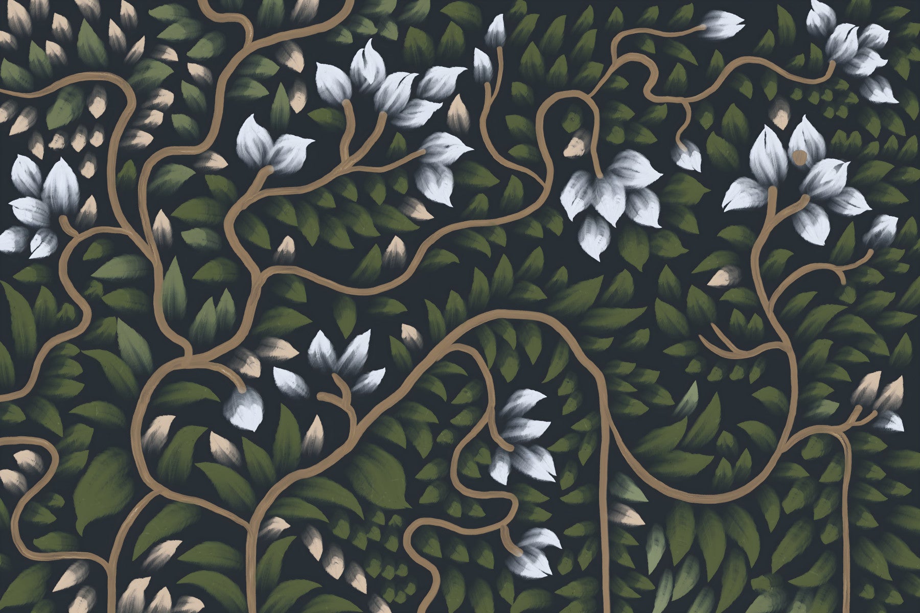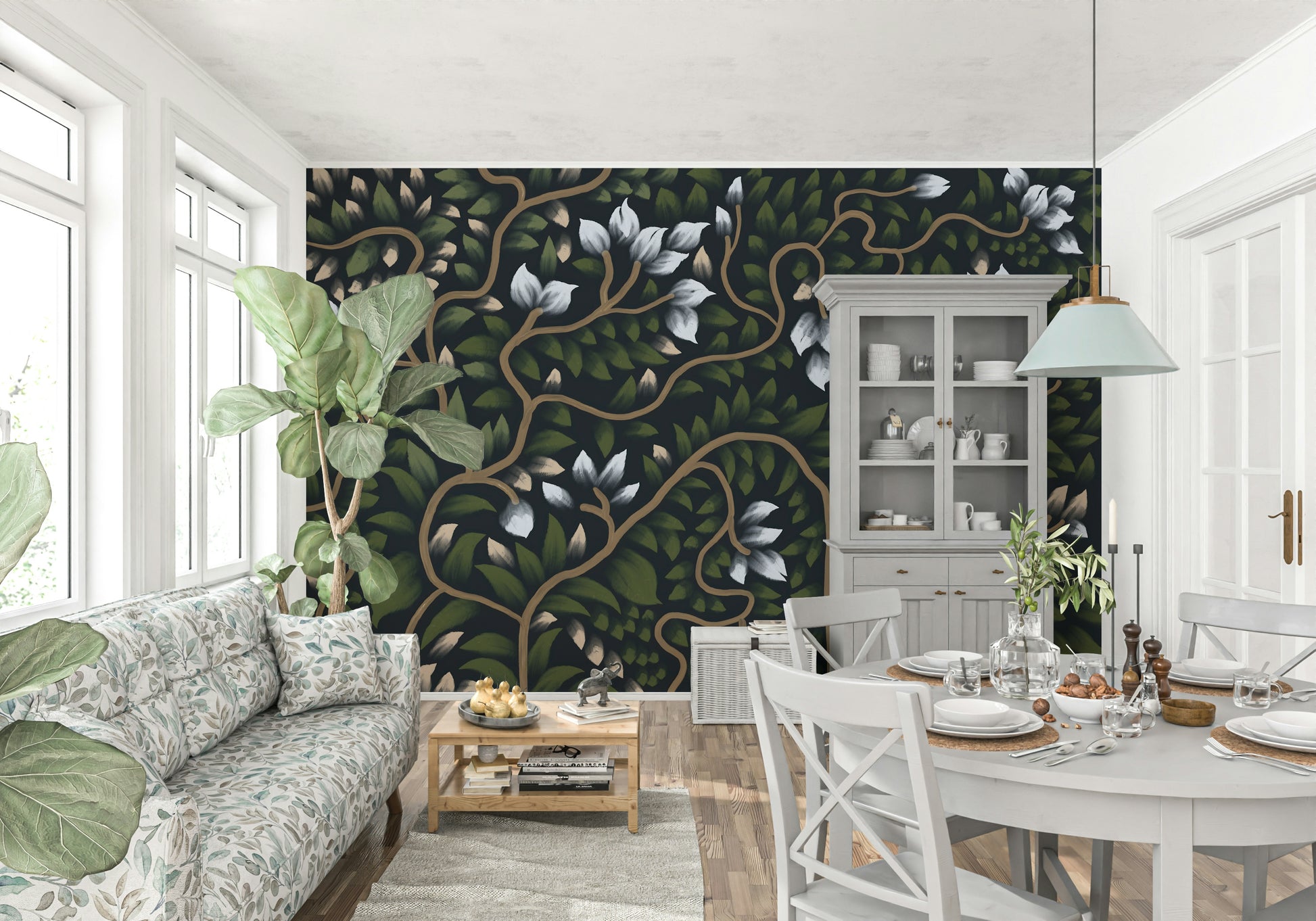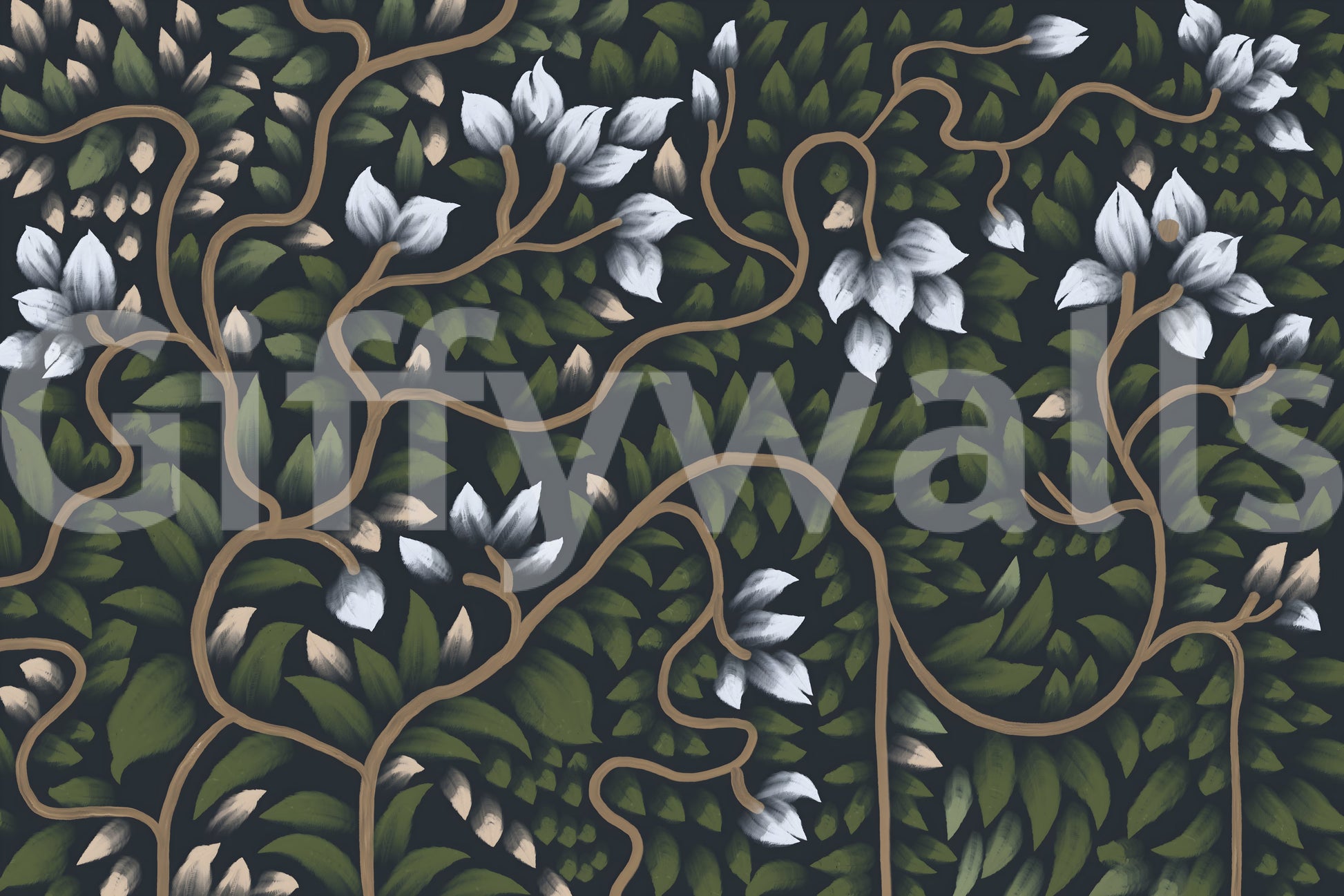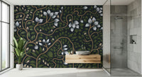 Bring the tranquility of a secret garden to your home with this captivating floral design. Lush greenery and delicate white petals dance across a deep backdrop, creating a sense of depth and intrigue. This wallpaper for walls is a great choice for those looking to add a touch of nature and sophistication to your space. Picture it enhancing a serene bedroom, an inviting living room, or a tranquil dining room. Its classic charm complements interiors with a touch of natural beauty.