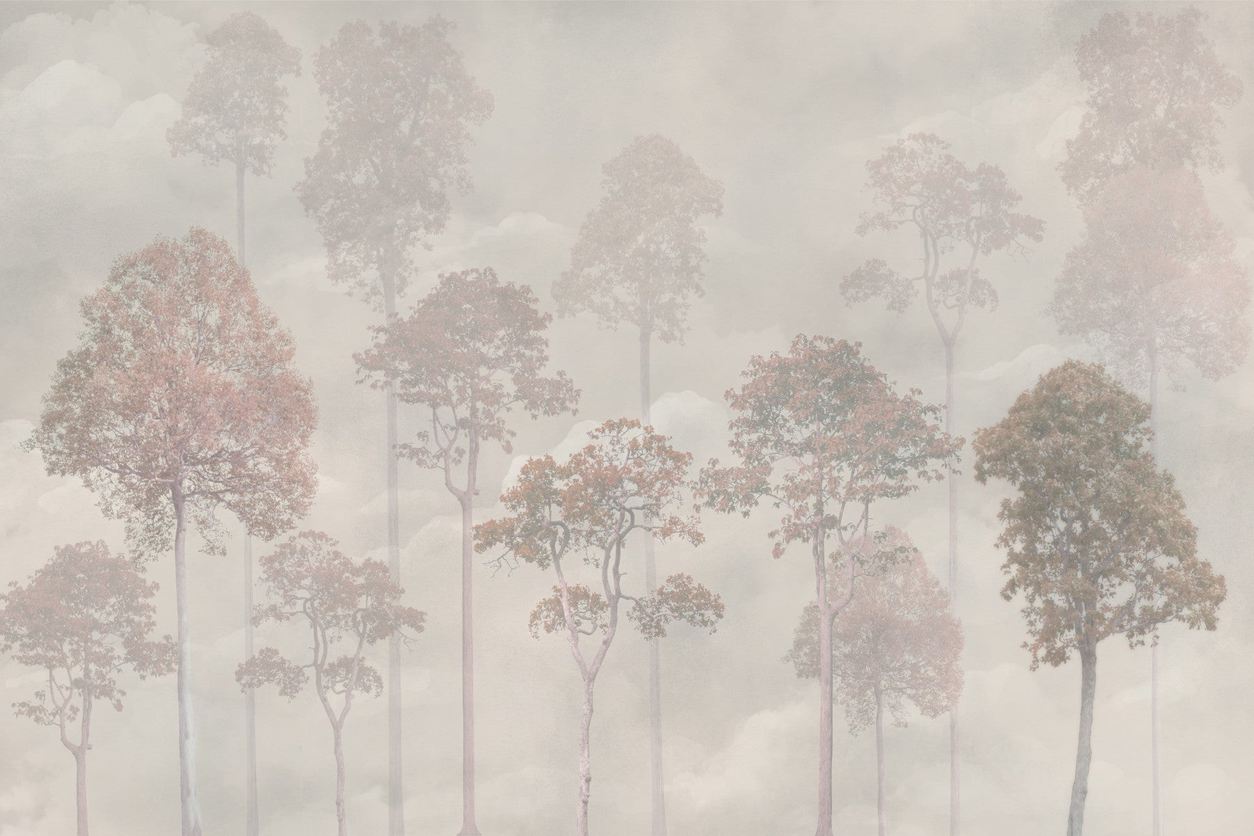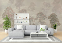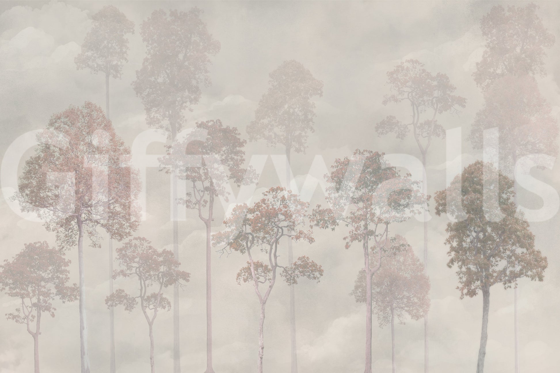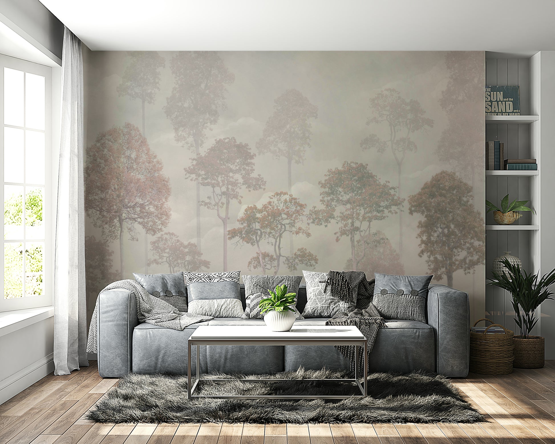 Escape into the ethereal beauty of 'Whispering Woods,' a serene wallpaper depicting a misty forest. Tall, slender trees stand silhouetted against a soft, muted background, their delicate branches hinting at secrets held within. A veil of fog softly blankets the scene, lending an air of mystery and tranquility. elegance to any space. Let the gentle whispers of the woods transport you to a place of peaceful serenity.