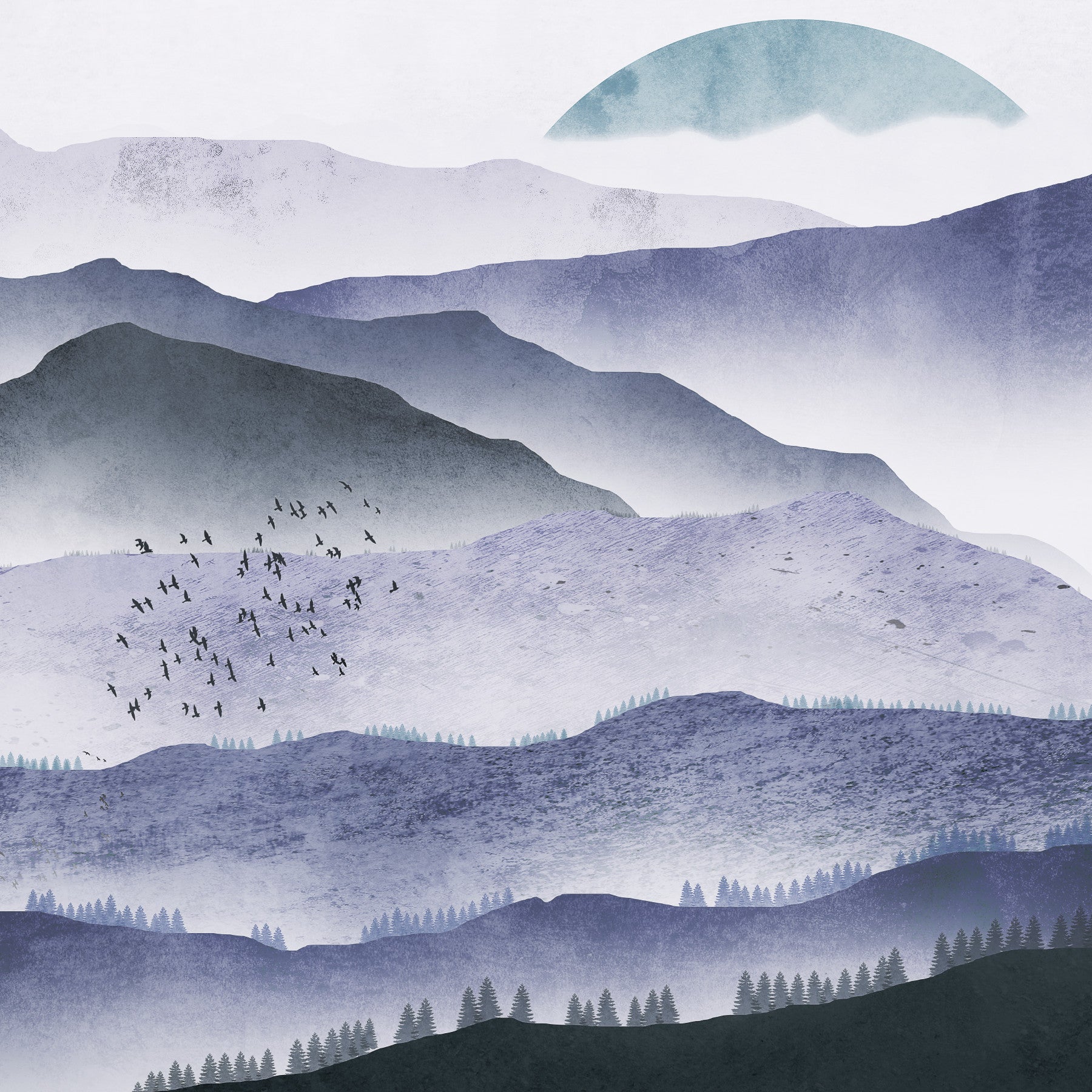 Immerse yourself in the ethereal beauty of 'Whispers of the Mountains,' a captivating wallpaper featuring a watercolor landscape. Delicate shades of blue and purple paint a breathtaking panorama of misty mountain peaks, each layer revealing a subtle texture and depth. The quiet movement of a flock of birds adds a sense of gentle motion to the scene. This minimalist artwork creates a calming atmosphere, infusing any space with a sense of tranquility and natural wonder. Its soft palette and painterly style make it a perfect choice for bedrooms, meditation spaces, or any area requiring a touch of sophisticated serenity.