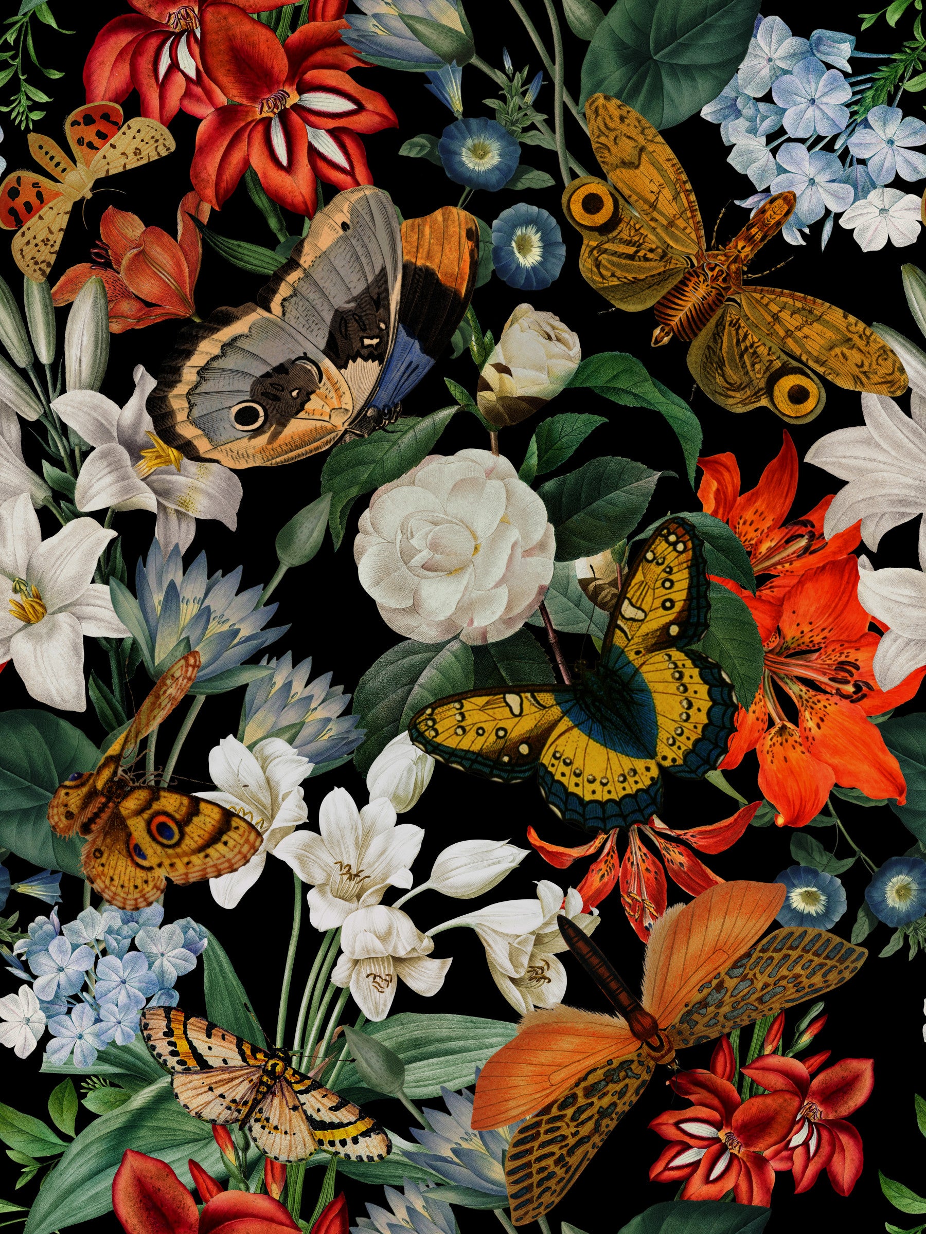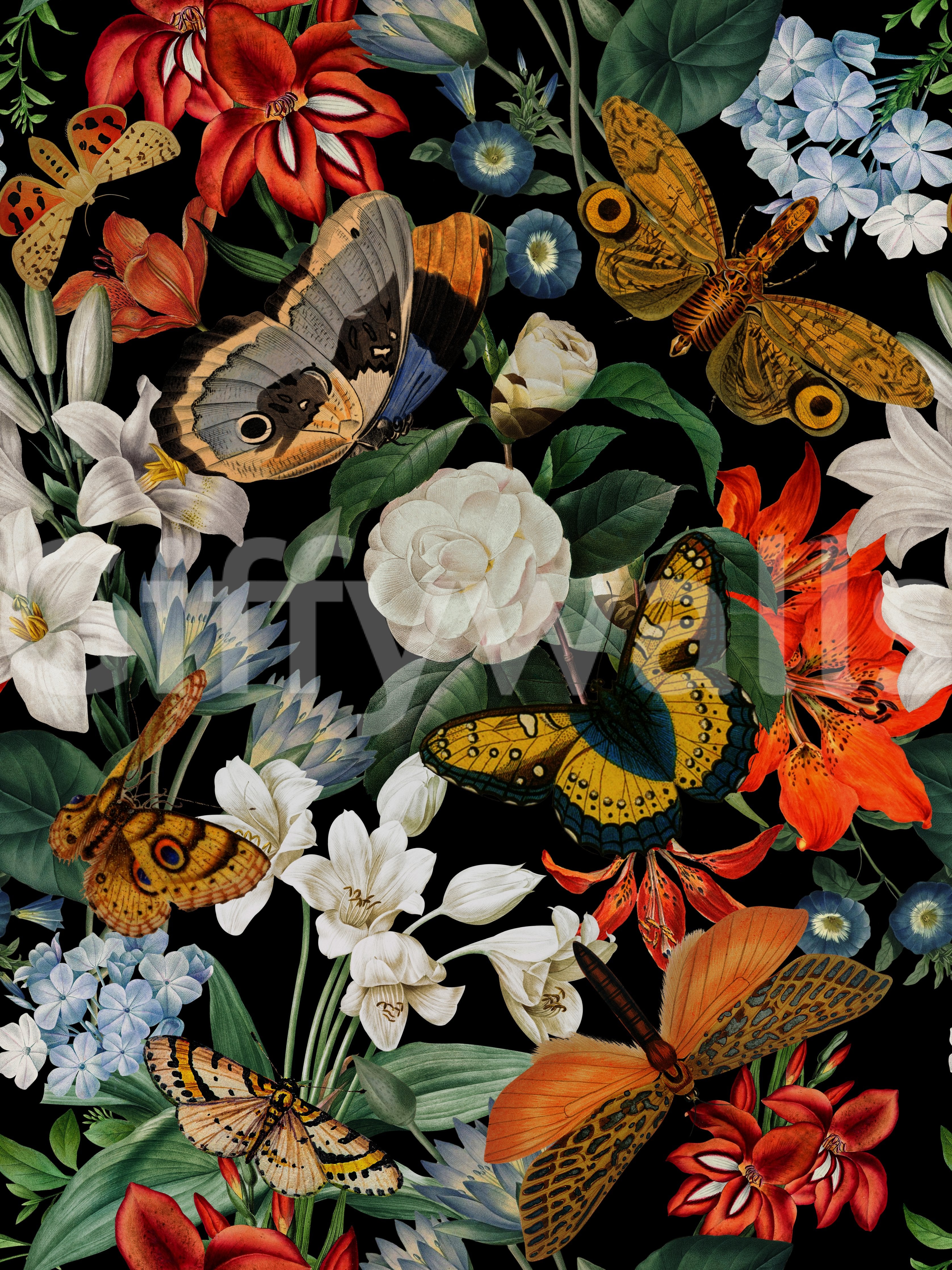 Experience the ethereal beauty of 'Whispers of the Night'. This wallpaper design features a captivating arrangement of flowers and butterflies rendered in a dark, dramatic palette. The intricate detailing of each element, from the delicate petals to the mesmerizing wing patterns, creates a sense of mystery and wonder. The color scheme, dominated by deep blacks, rich reds and oranges, and accented with soft blues and whites, evokes a feeling of quiet elegance. This wallpaper is ideal for those seeking a sophisticated and unique statement piece for their home, adding depth and intrigue to any room.