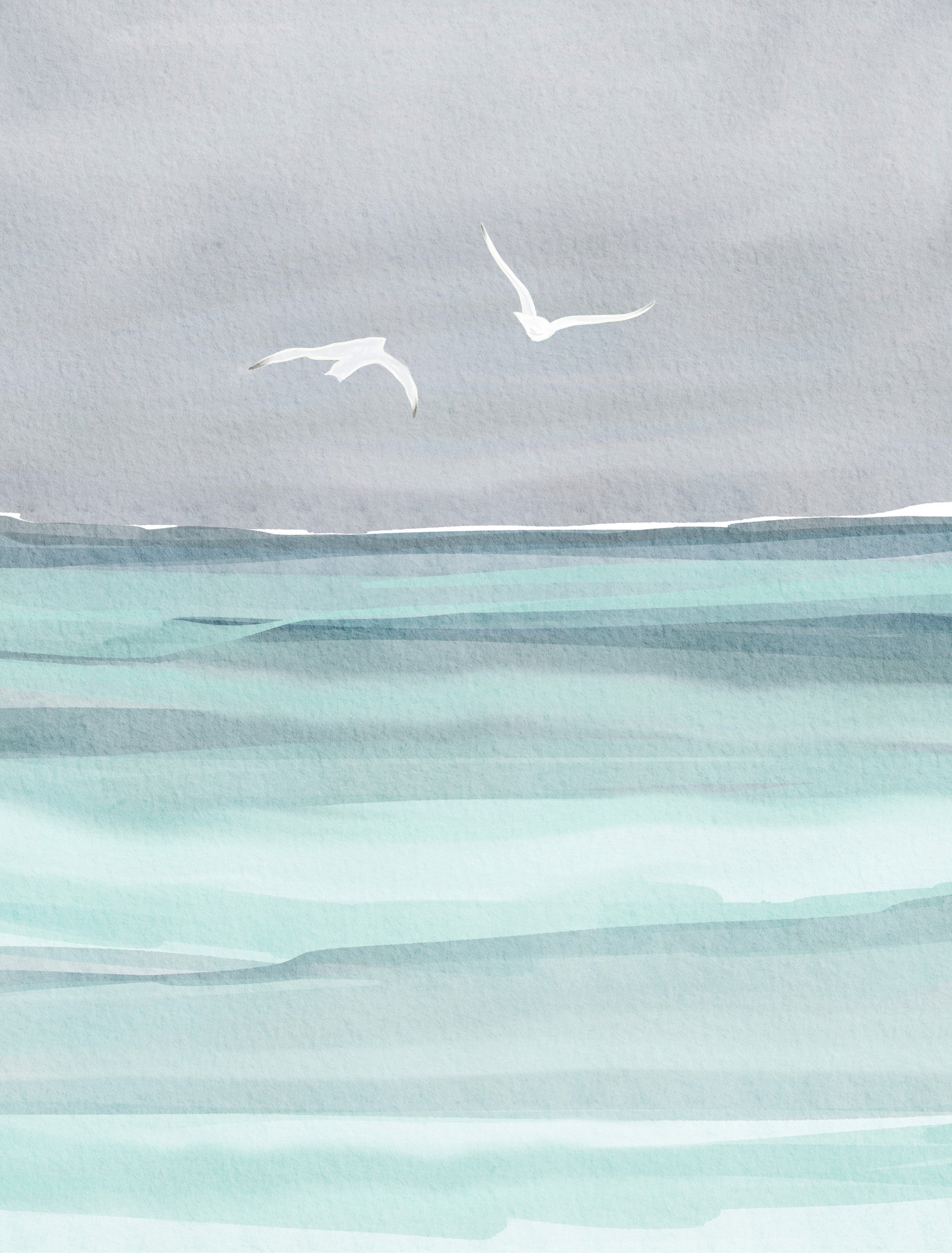 This watercolor wallpaper, 'Whispers of the Sea,' captures the quiet beauty of a tranquil ocean scene. Soft layers of blue-green hues create a dreamy, atmospheric effect. Two stylized birds in flight punctuate the expanse of the sky and water, adding a touch of grace and subtle movement. The overall feel is one of serene contemplation, perfect for creating a calming atmosphere in a bedroom, meditation space, or any area where relaxation is prioritized. Its understated elegance and muted color palette make it a versatile choice for a variety of interior styles.