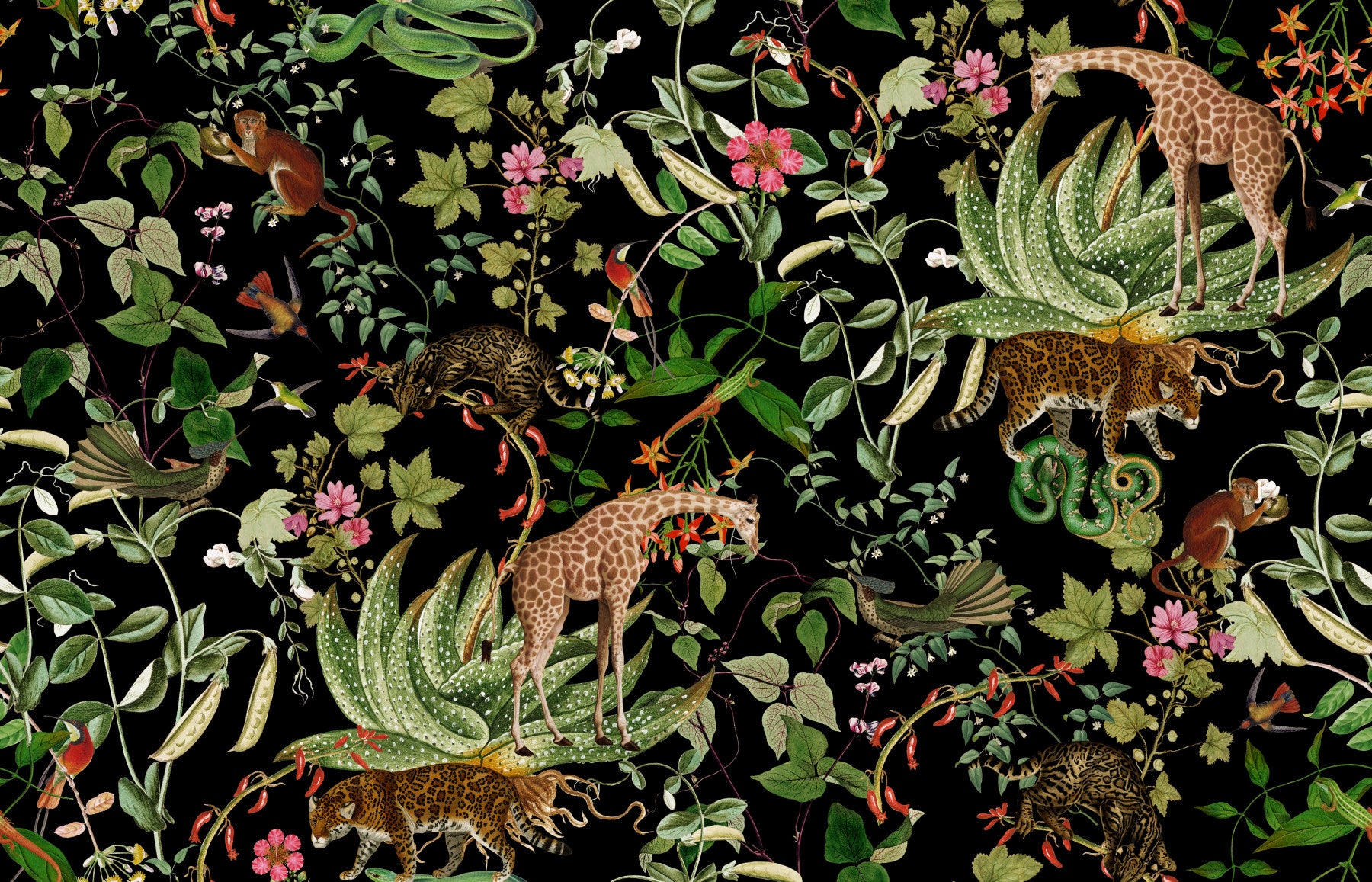 This wallpaper whispers secrets of the wild, a breathtaking tapestry of vibrant jungle life against a dramatic black backdrop. Detailed illustrations of giraffes, jaguars, and playful monkeys mingle with exquisite botanical elements – flowering vines, lush leaves, and exotic blooms. The intricate details and rich jewel tones create a mesmerizing effect, offering a luxurious and adventurous ambiance. Perfect for adding a touch of exotic charm and visual intrigue to any space, transforming it into a tranquil sanctuary.