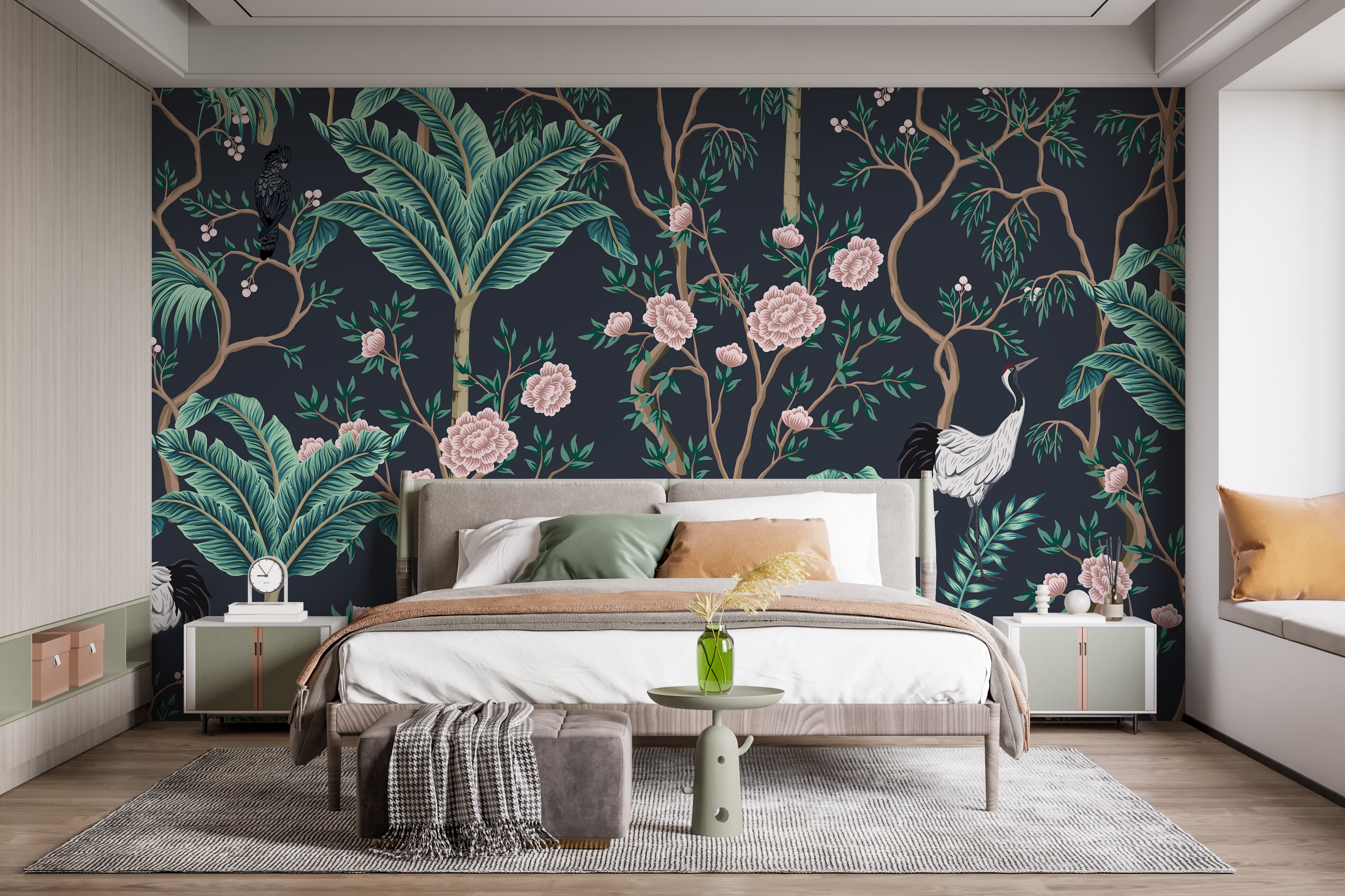 This elegant mural wallpaper features a graceful dance of nature's charm against a deep black backdrop. Graceful white birds, resembling cranes or egrets, stand poised amidst lush greenery, their feathers detailed in a way that conveys softness and texture. The verdancy of the leaves, drawn with a lifelike vibrancy, contrasts with the delicate pink florals that bloom with serene beauty. Each branch and petal is rendered with artistic precision, creating a botanical scene that's both dynamic and serene. This design invites a touch of the natural world's quiet beauty into any room, offering a visual retreat that captivates and soothes. Ideal for those looking to add a piece of nature-inspired artistry to their walls, this wallpaper is a testament to the timeless elegance of floral and fauna motifs.