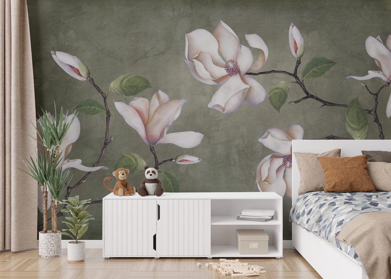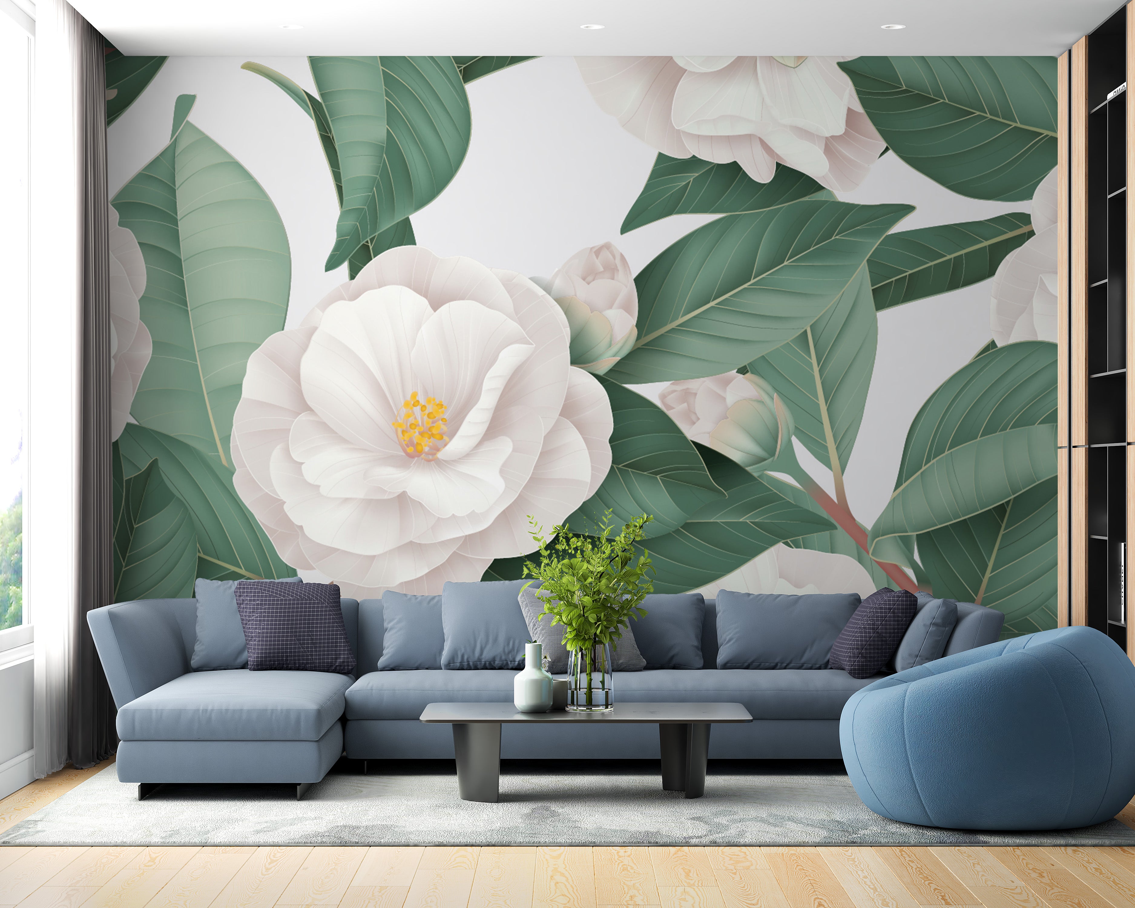 Sophisticated white camellia wallpaper mural for modern spaces.