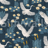 Bring the serene beauty of a Japanese garden into your home with this captivating wallpaper. Elegant white herons, wings outstretched, gracefully navigate a tranquil pond adorned with delicate waterlily blossoms. The muted blue background subtly features a textured pattern, adding depth and visual interest. The color palette is carefully curated, combining serene blues, soft creams, and subtle gold accents to create a calming and sophisticated atmosphere. Ideal for bedrooms, living rooms, or any space where you desire a sense of peaceful elegance.