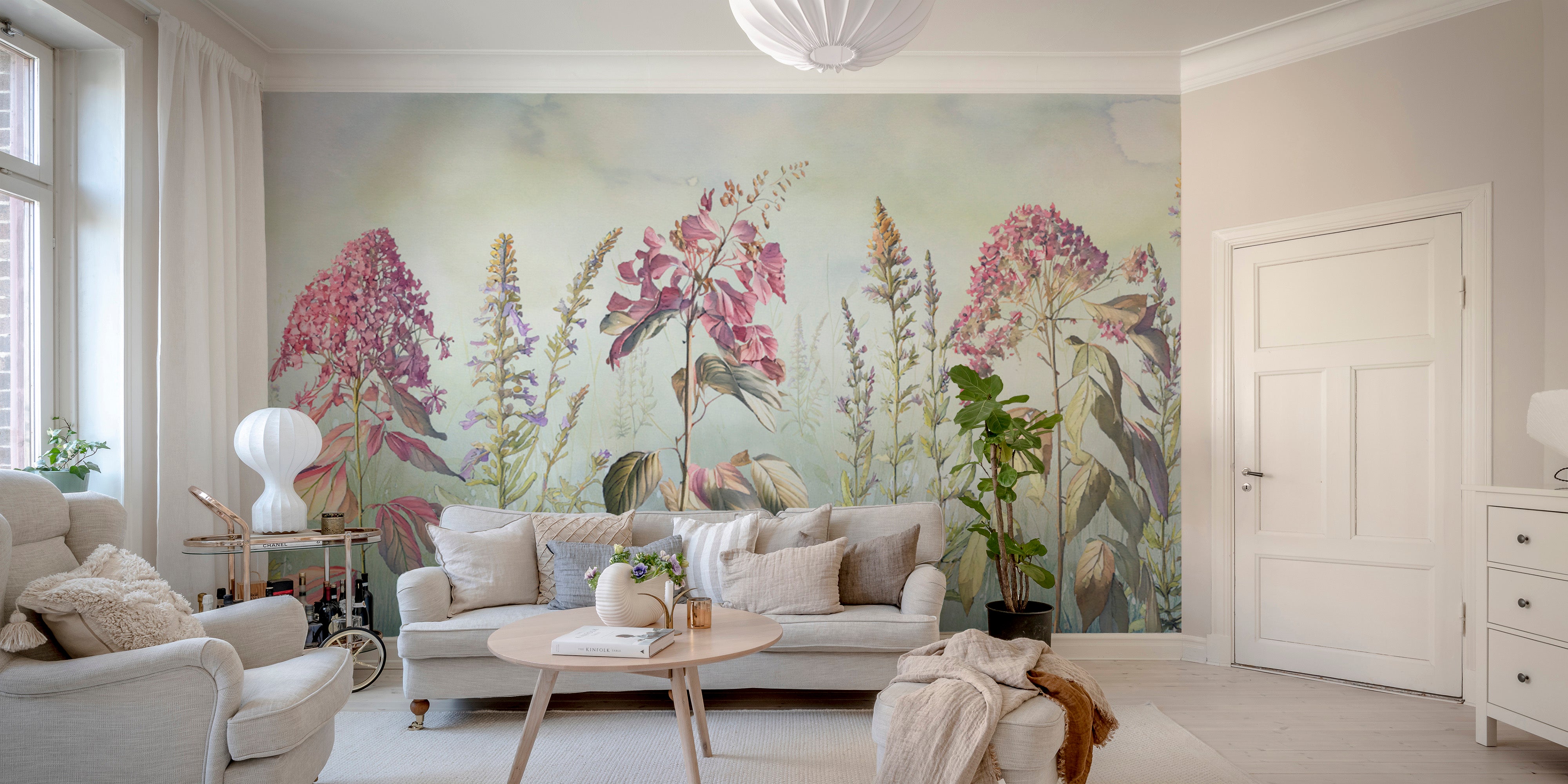 Refresh your walls with beautiful wild flowers meadows blue wallpaper.