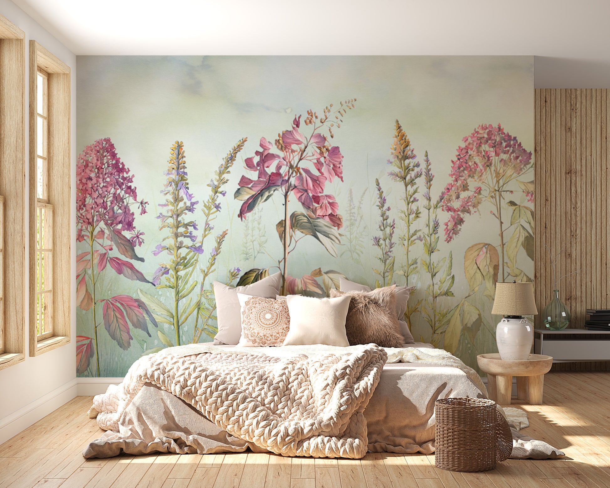 Wild flowers meadows blue wallpaper mural for a serene room ambiance.