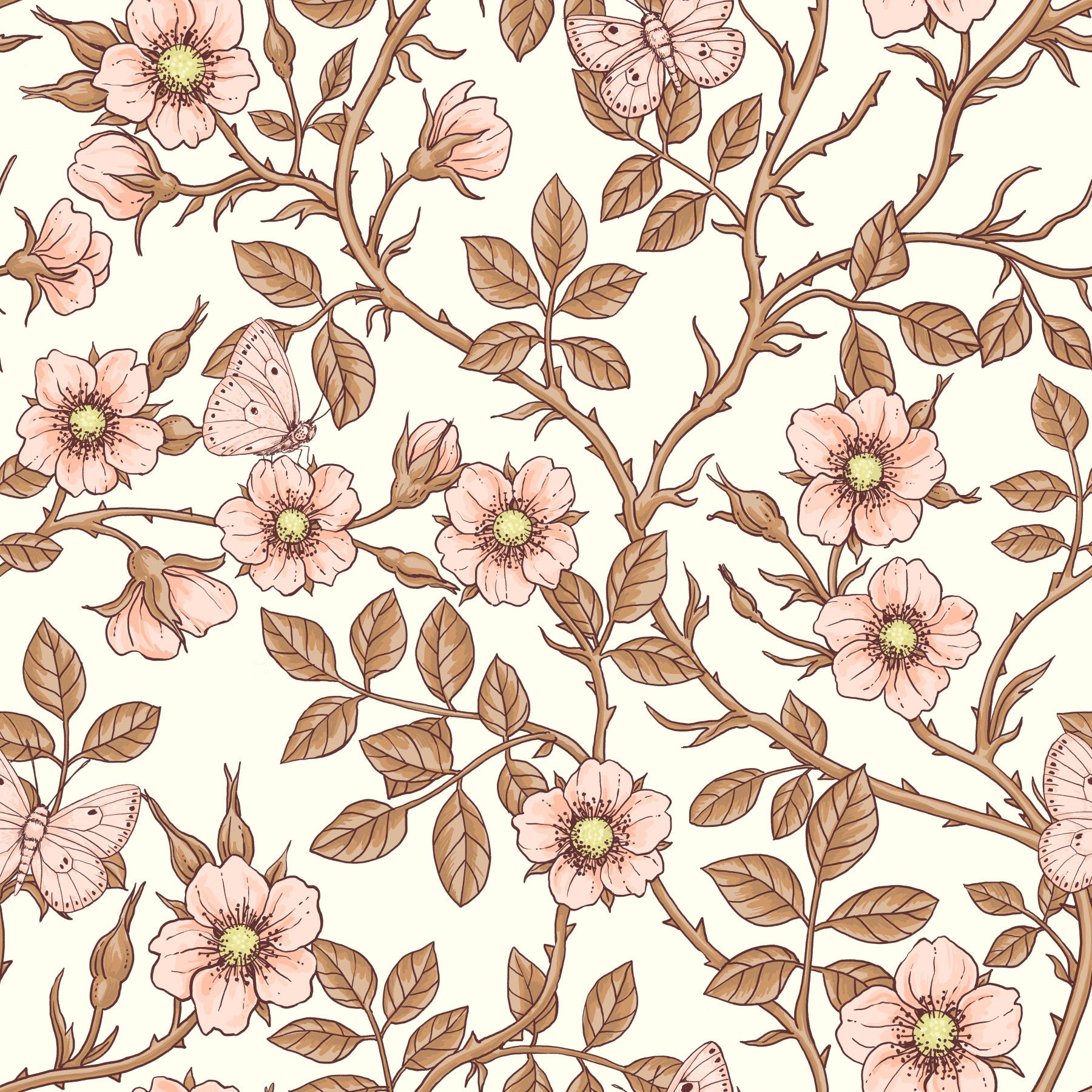 Embrace the delicate charm of nature with this "Wild roses and butterflies" wallpaper. A tapestry of blush pink wild roses intertwines with graceful brown branches, their intricate leaves adding depth and texture. Dainty butterflies, rendered in subtle pink and brown hues, flutter amongst the blossoms, creating a sense of airy lightness. The soft, off-white background provides a gentle, neutral canvas, allowing the floral and insect motifs to take center stage. This wallpaper evokes a feeling of serene beauty, perfect for creating a calming and inviting atmosphere in any room. Its classic design ensures a timeless elegance, blending seamlessly with a variety of interior styles. A sophisticated choice for lovers of botanical art and understated luxury.