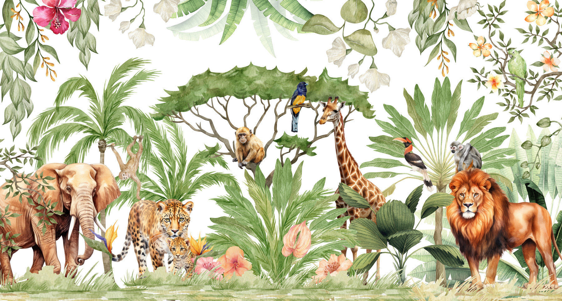 This captivating wallpaper transports you to a vibrant tropical paradise teeming with wildlife. Hand-painted in a delicate watercolor style, the design features a diverse array of animals – an elephant, a majestic lion, a giraffe, and playful monkeys – all nestled amidst lush greenery and exotic blooms. Palm trees sway gently, and a variety of colorful birds add to the lively atmosphere. The whimsical feel makes it perfect for a child's room, while the elegant composition ensures it's suitable for any space that needs a touch of exotic charm and vibrant artistry.