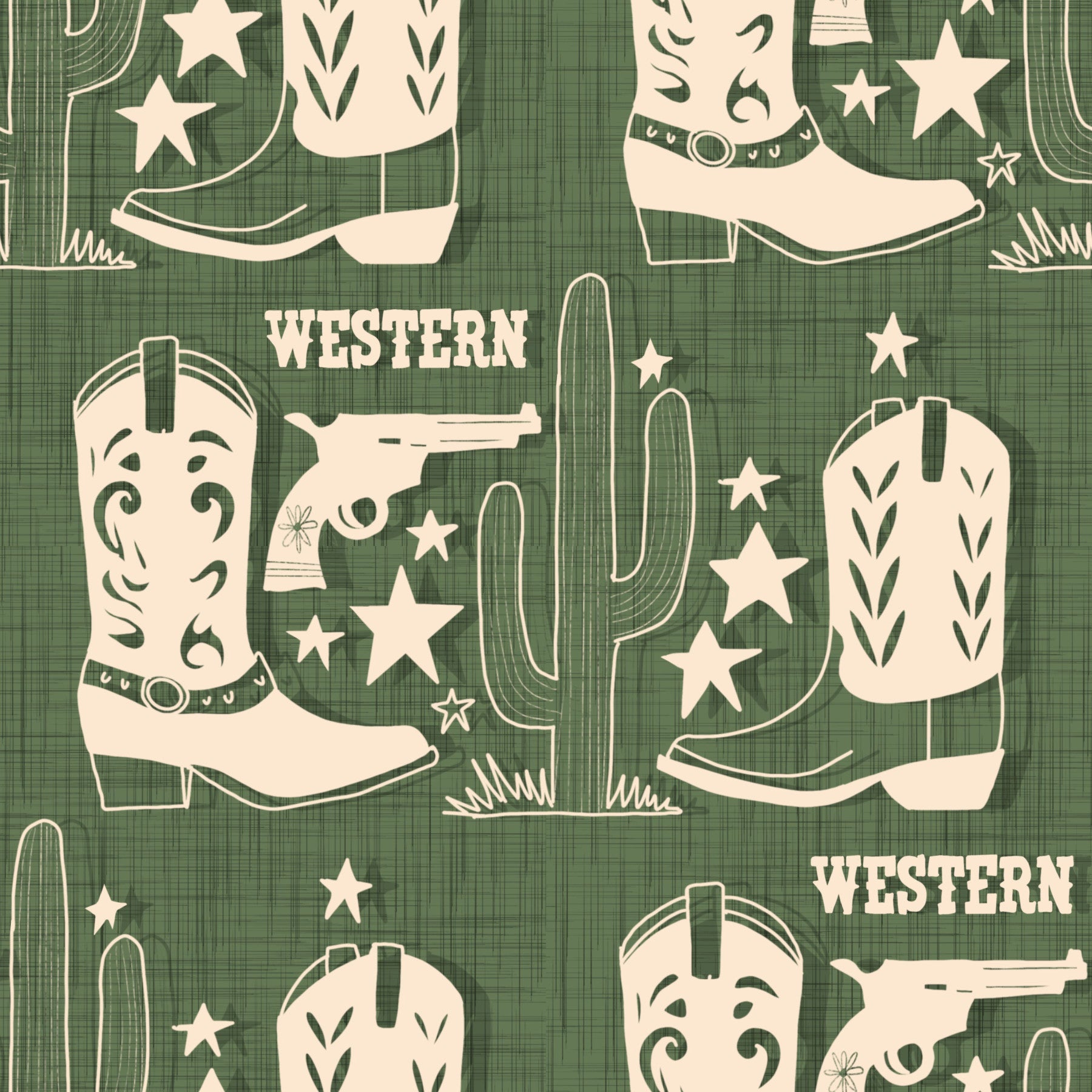 Step into a world of cowboys, cacti, and starry skies with this unique wallpaper for walls. It presents a playful take on the American West featuring cowboy boots, cacti, revolvers, and stars in a light beige against an olive-green linen-textured background. This design blends rustic charm with a touch of whimsy, perfect for a kid's room, playroom, or any space that wants a hint of the frontier. Imagine this design gracing the walls of a study or library, adding a distinct personality to the interiors.