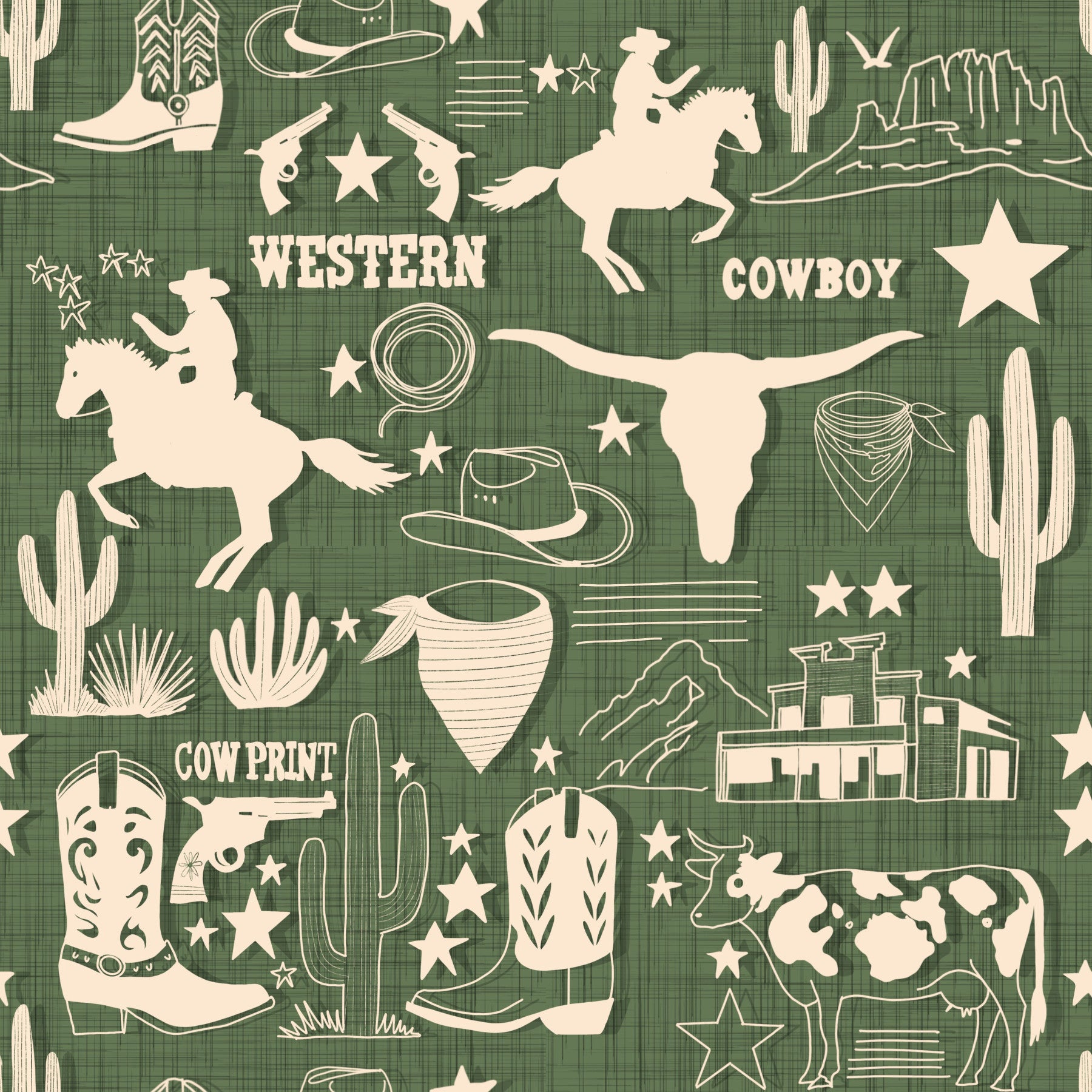 Wild West Sketch wallpaper featuring hand-drawn cowboy motifs, longhorns, and cacti on a textured green background.