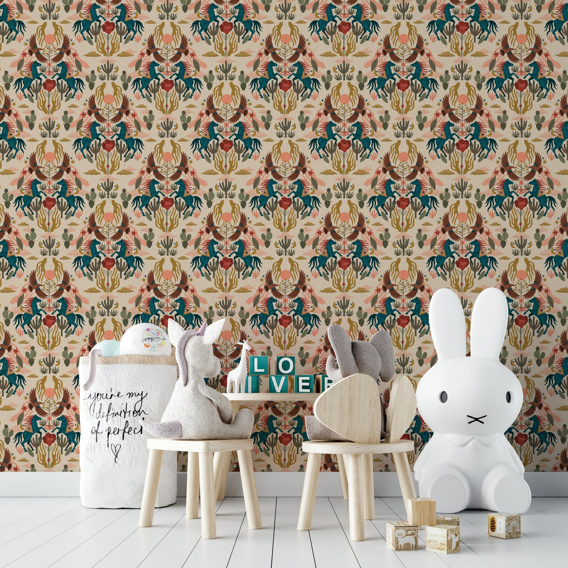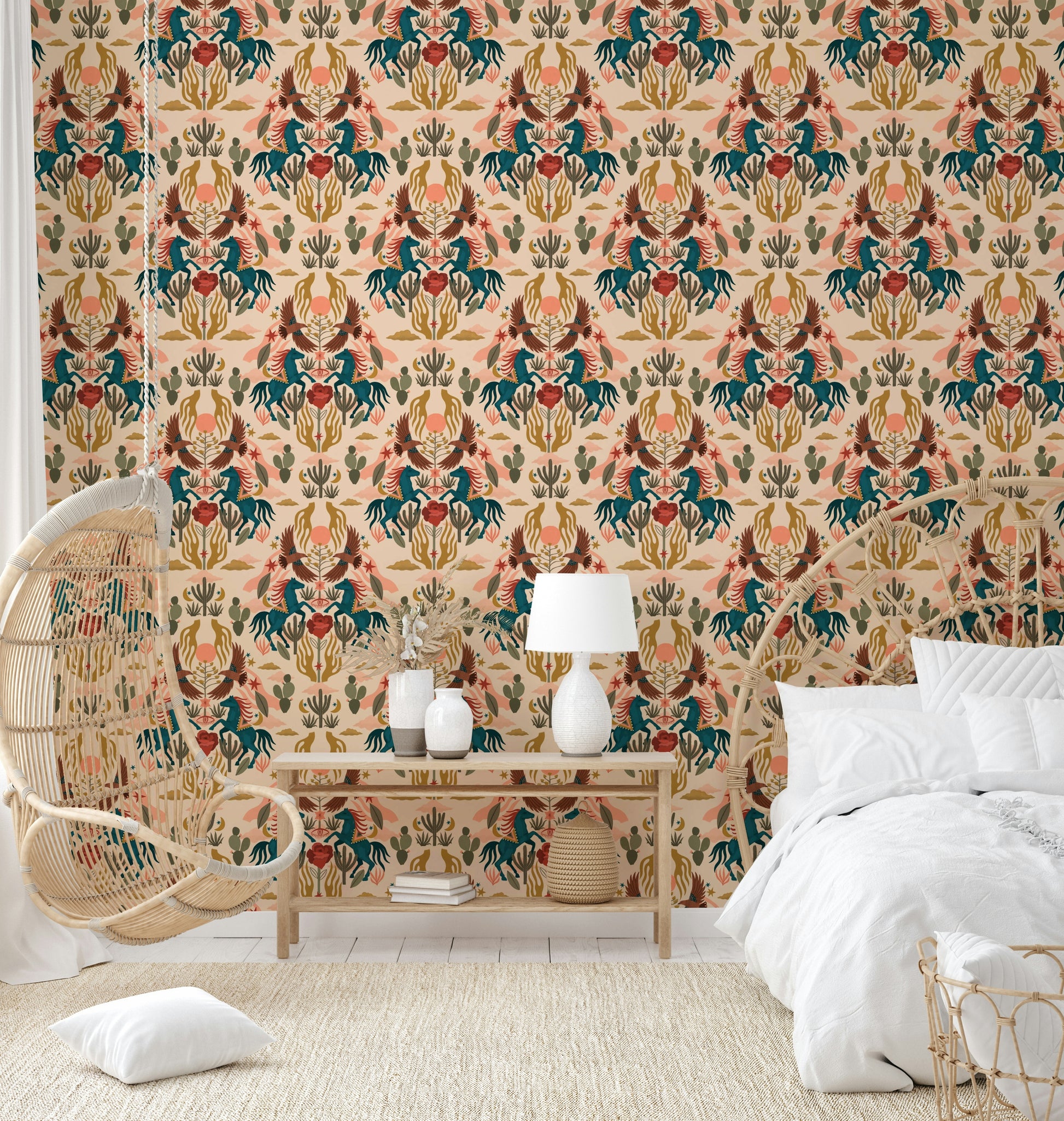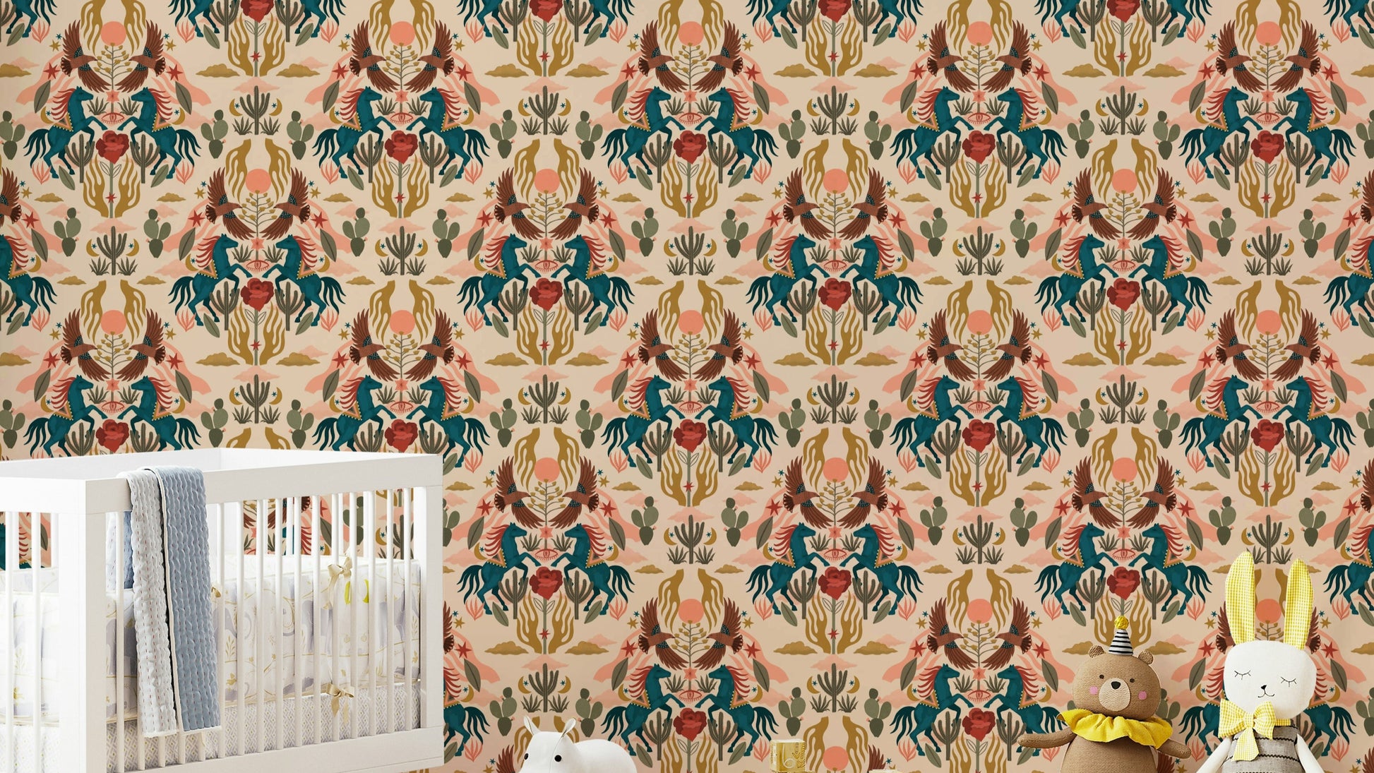 Embrace the mystical beauty of the Wild West with this captivating wallpaper. Vibrant teal horses, adorned with ornate blankets, leap across a stylized desert landscape under a peach-hued sunset. Soaring birds and majestic cacti create a balanced, symmetrical design, complemented by earthy tones and celestial motifs—moons, stars, and stylized clouds. The overall aesthetic blends Southwestern imagery with a touch of Art Deco, creating a unique and sophisticated Wild West experience for your desktop.