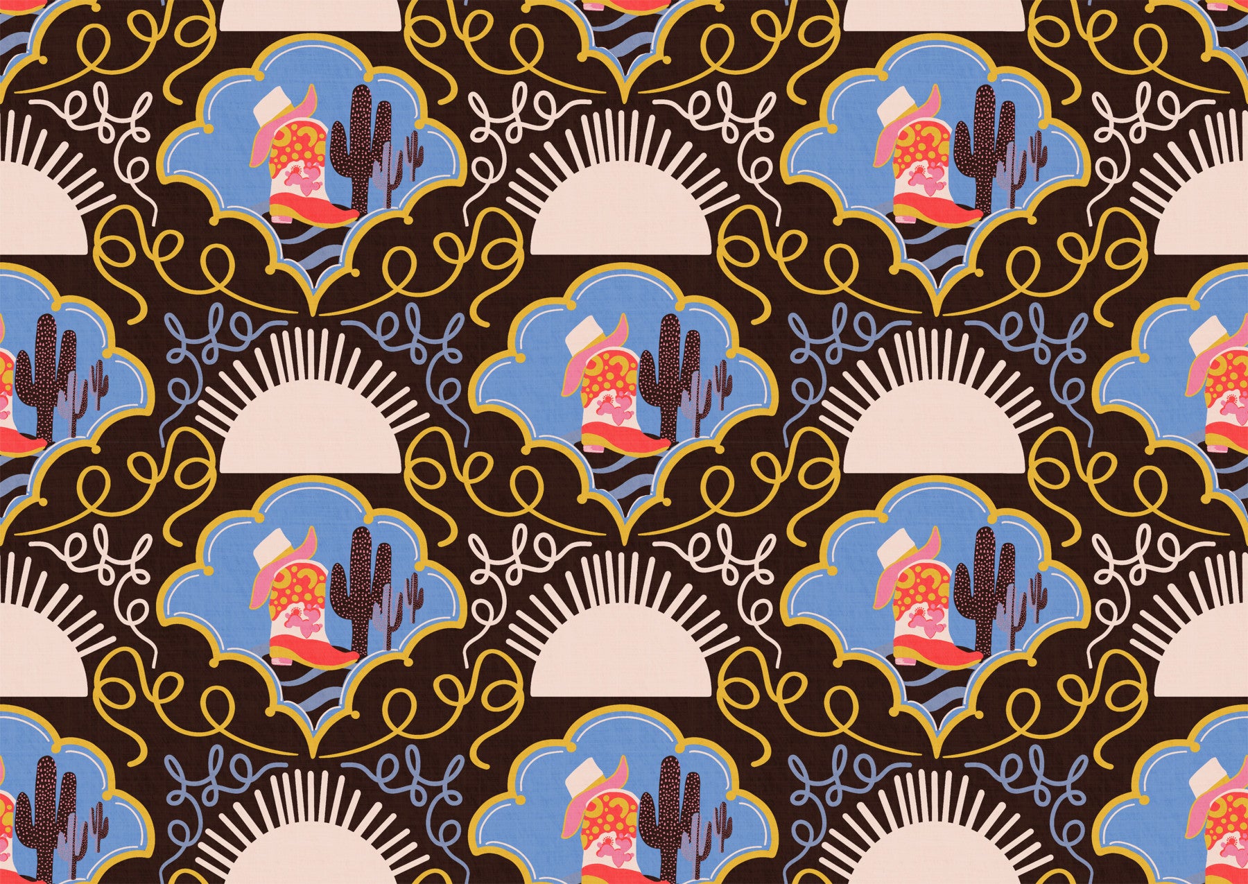 Step into a colourful Western daydream with this version of Wild West Whimsy. Bold red cowboy boots, sun motifs in soft cream and yellow, and hand-drawn cacti pop against a warm brown backdrop and sky-blue desert floor. Swirling yellow and blue lines create a sense of playful motion, echoing the rhythm of the open plains. Perfect for cowboy- or cowgirl-themed kids’ bedrooms, lively playrooms, or imaginative home offices, this wallpaper brings rustic charm and joyful storytelling to any space. A conversational design that’s perfect for fans of Western decor, folk-art illustration, and bold, personality-filled interiors.