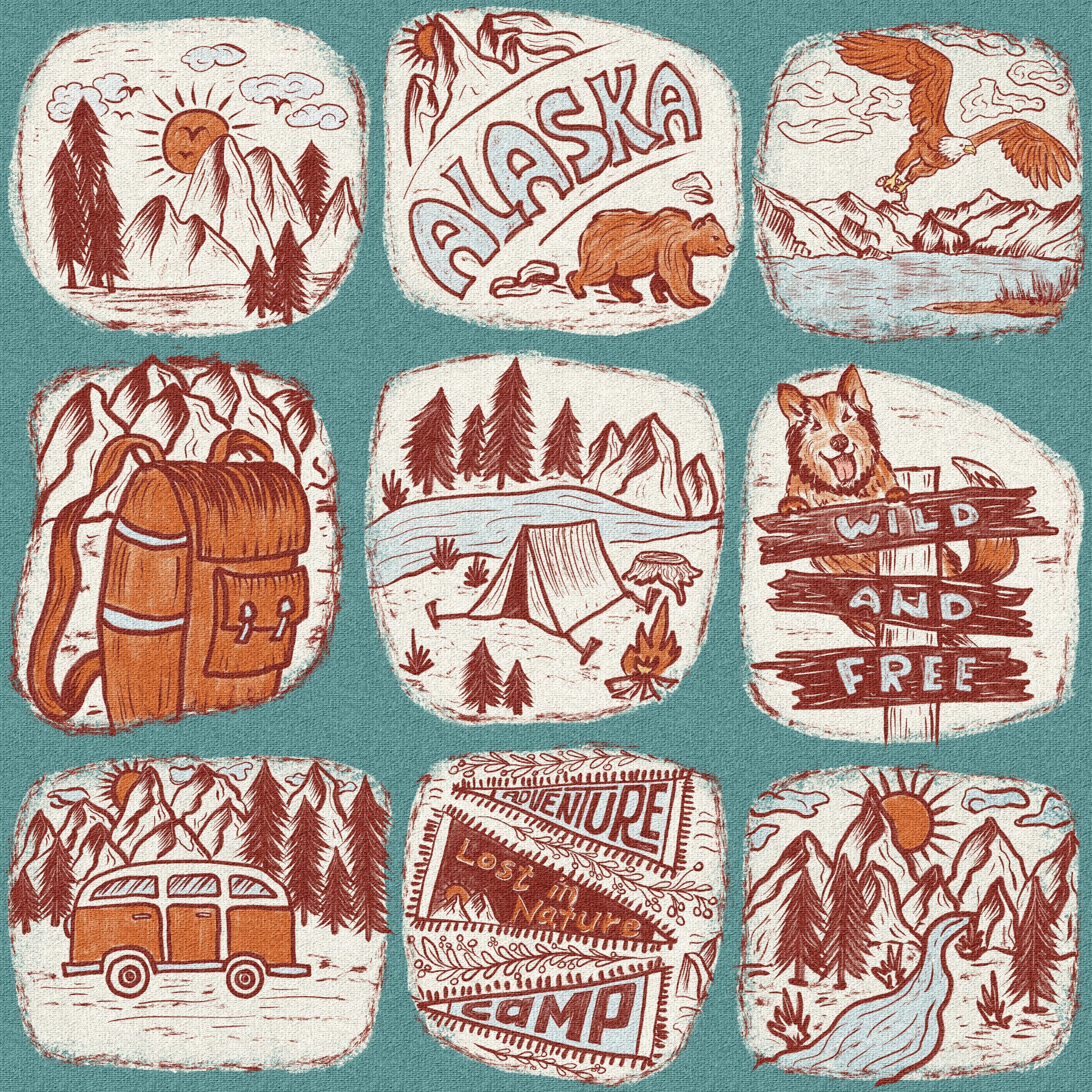 Explore the great outdoors with this charming, illustrated wallpaper for walls! The design showcases a collection of rustic sketches that include mountains, forests, camping, and wildlife. Rendered in earth tones like terracotta and teal, the scenes evoke a sense of adventure and tranquility. Install this unique wallpaper in a living room, bedroom, or home office to bring a touch of natural beauty to any space. The design complements rustic, bohemian, or modern interiors.