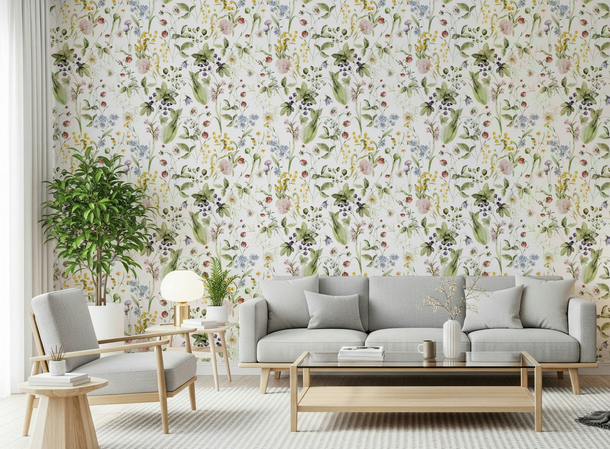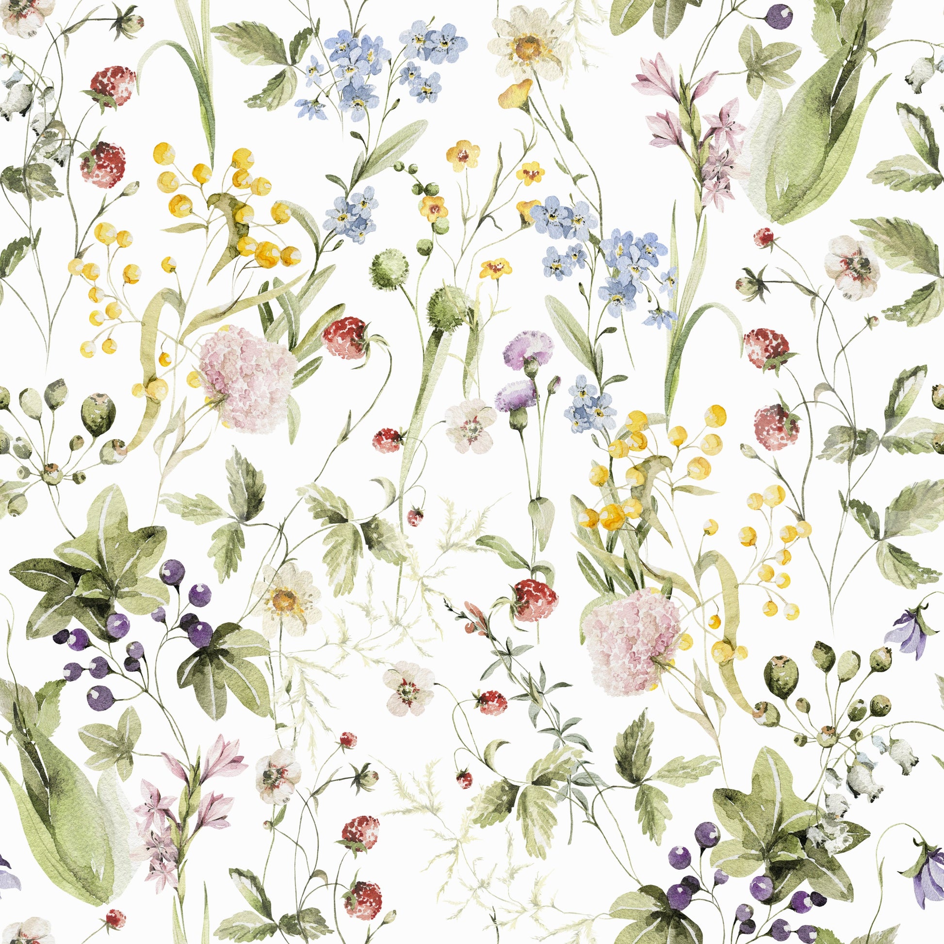 Escape into a whimsical meadow with "Wildflower Dreams," a wallpaper by Uta Naumann that captures the delicate beauty of nature in its purest form. This design features a watercolour-inspired assortment of wildflowers and berries, painted in soft, muted tones of blue, yellow, pink, and green against a clean white backdrop. Forget-me-nots mingle with creamy daisies and delicate pink blooms, while clusters of ripe berries peek out from lush foliage. The artistry evokes a sense of tranquility and serenity, transforming any space into a peaceful sanctuary. "Wildflower Dreams" brings the serene feeling of a sun-dappled afternoon into your home, ideal for creating a calming atmosphere in bedrooms, living rooms, or any space where you wish to infuse a touch of natural beauty and gentle charm.
