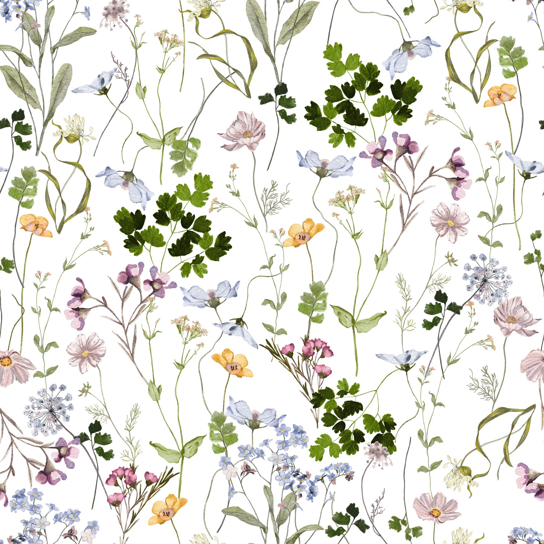 Transform your living space with the serene beauty of this wildflower meadow wallpaper for walls by Uta Naumann. Delicate watercolour blossoms in hues of blues, yellows, pinks, and purples dance across a clean white background, creating a calm and inviting atmosphere. The hand-painted style brings a touch of nature indoors, perfect for bedrooms, living rooms, or hallways. Let this pattern instill a sense of tranquility and subtle elegance, harmonising effortlessly with a range of interior design styles from classic to modern. This design enhances natural light and brings a refreshing look to your rooms.