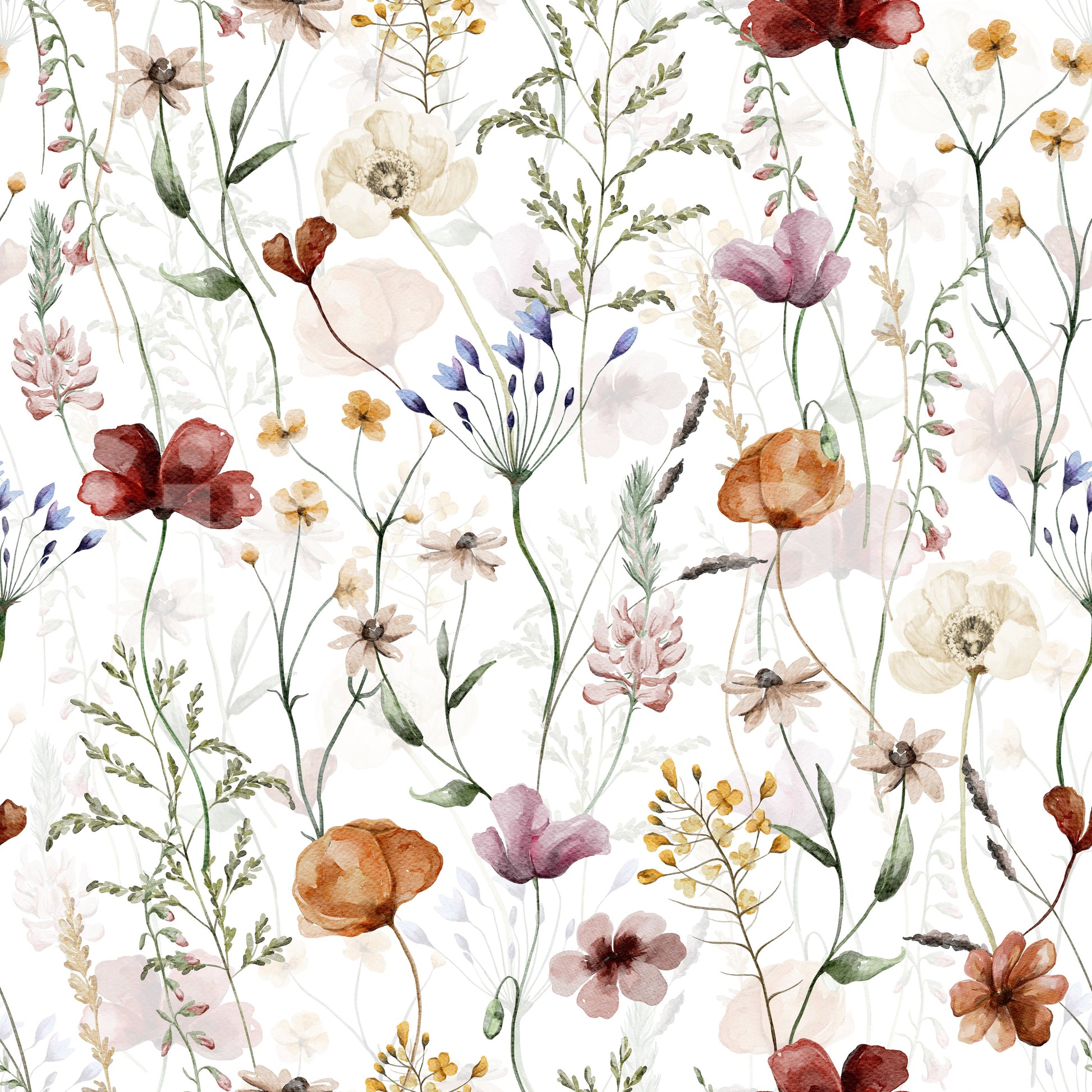 Transform any space with the delicate beauty of this floral design by Uta Naumann. A watercolour effect brings wildflowers to life, featuring a soft, dreamy aesthetic. Colours like burgundy, yellow, blue, and pale pink harmonise to create a soothing and refined ambiance. Designed as wallpaper for walls, it instantly enlivens bedrooms, living rooms, and hallways. This style wonderfully complements interiors with a farmhouse or minimalist approach, adding a refreshing, nature-inspired touch. Enjoy an easy installation and elevate your home's style with this captivating and calming pattern.