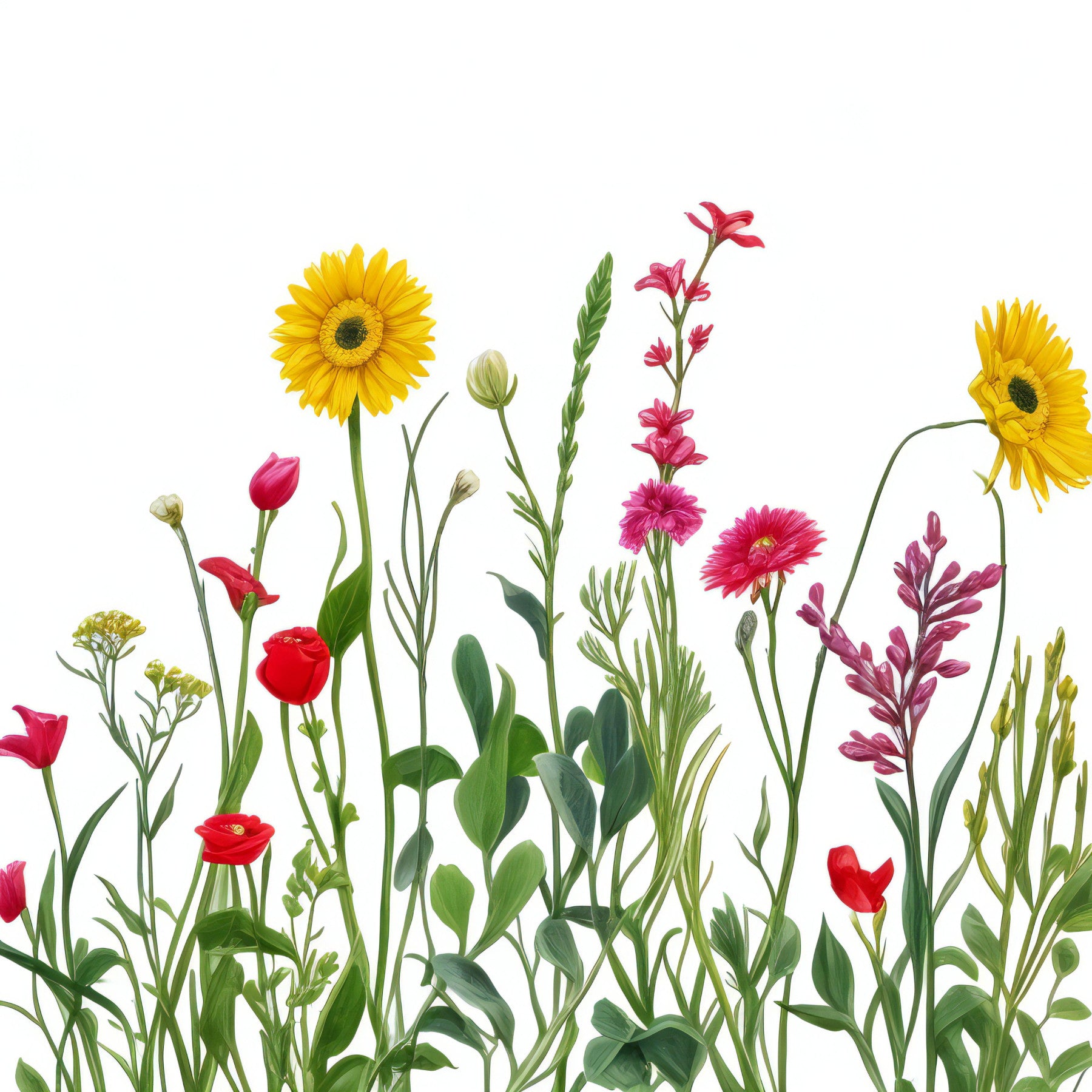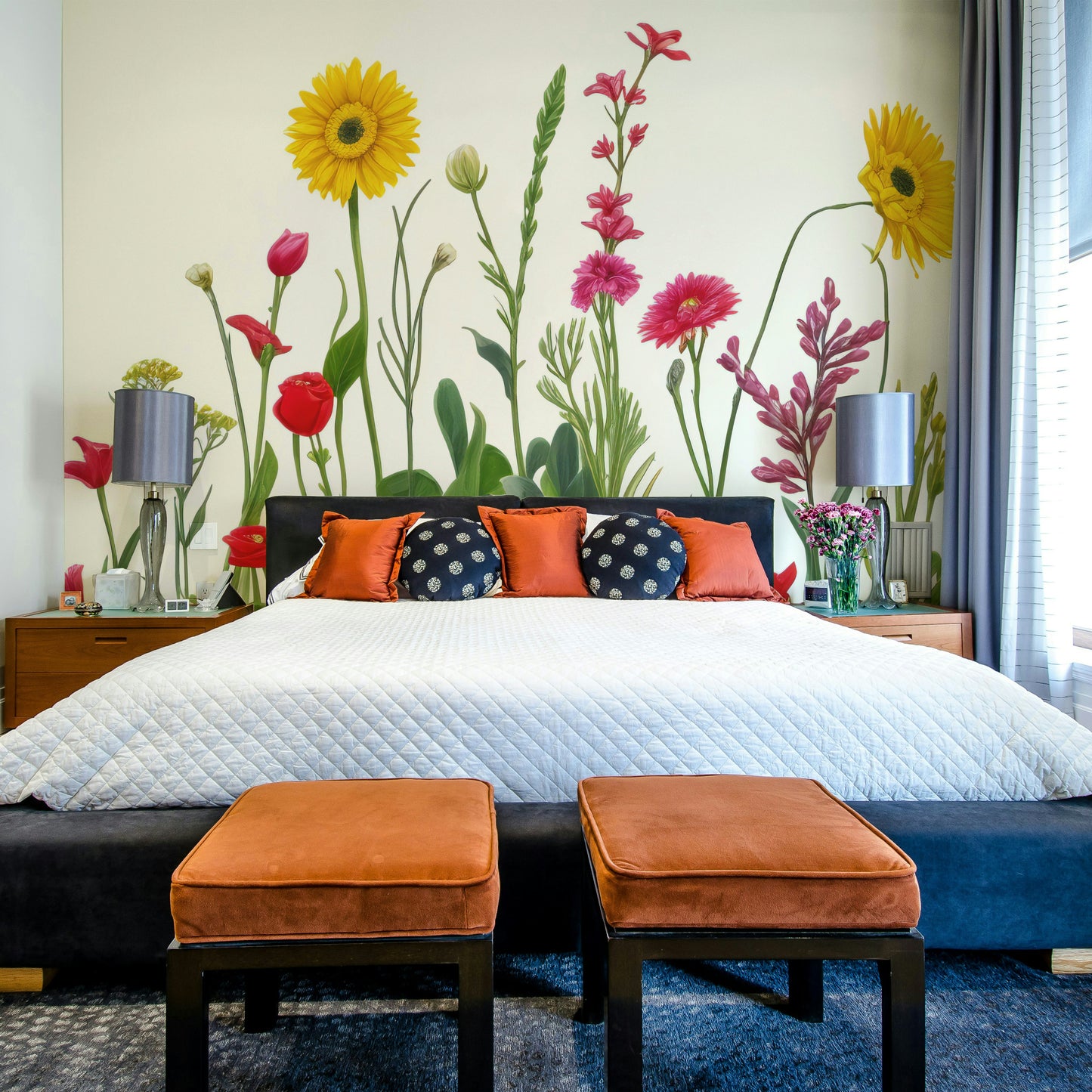 Bring the charm of a wildflower meadow indoors with this bright wallpaper for walls. Notice the vibrant yellow and red blooms that pop against the clean white background, creating a fresh and cheerful atmosphere. Green foliage adds depth and balance. This design livens up any room. It works beautifully in kitchens, living rooms, or bedrooms, infusing spaces with a touch of nature's beauty. The artful composition brings instant style to your interiors.