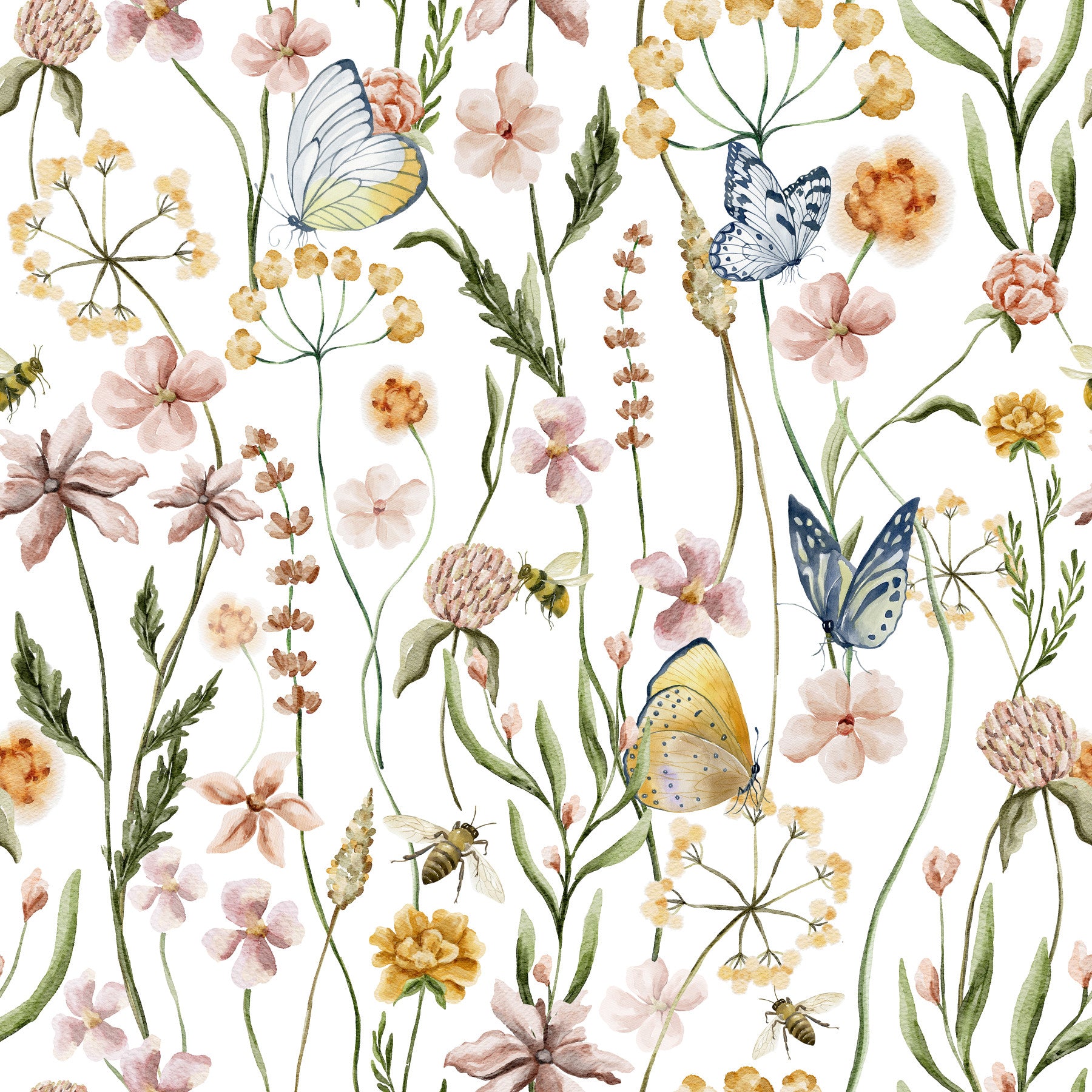 Watercolor butterflies, bees, and blooming wildflowers in wallpaper Whispers.
