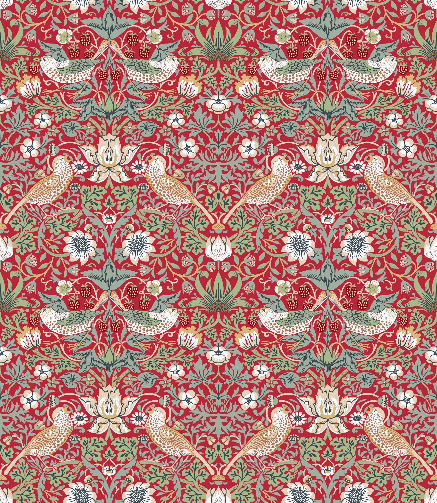 The image shows a repeating design of birds, vines, and strawberries.