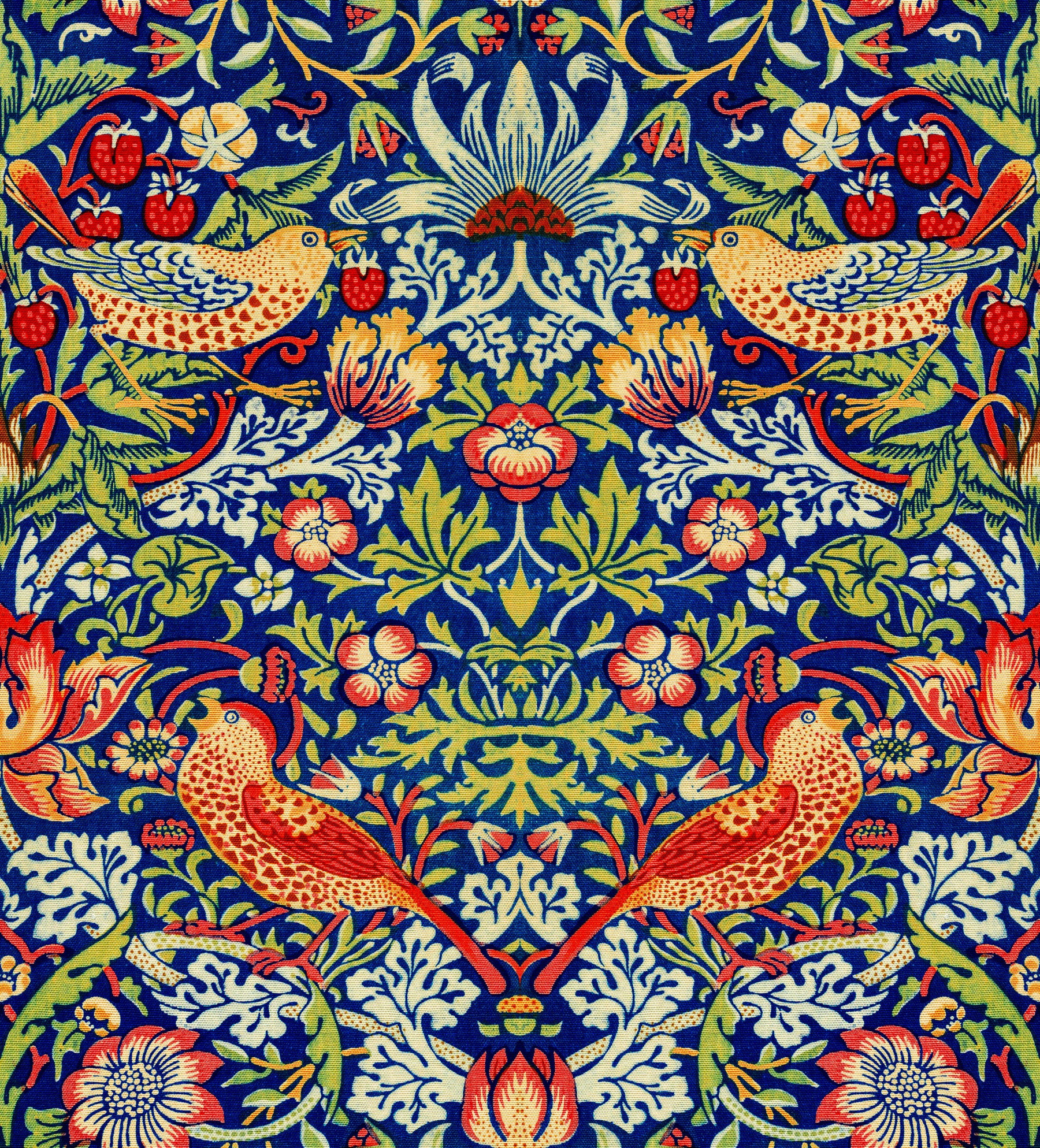 The image shows a repeating design of birds, vines, and strawberries.