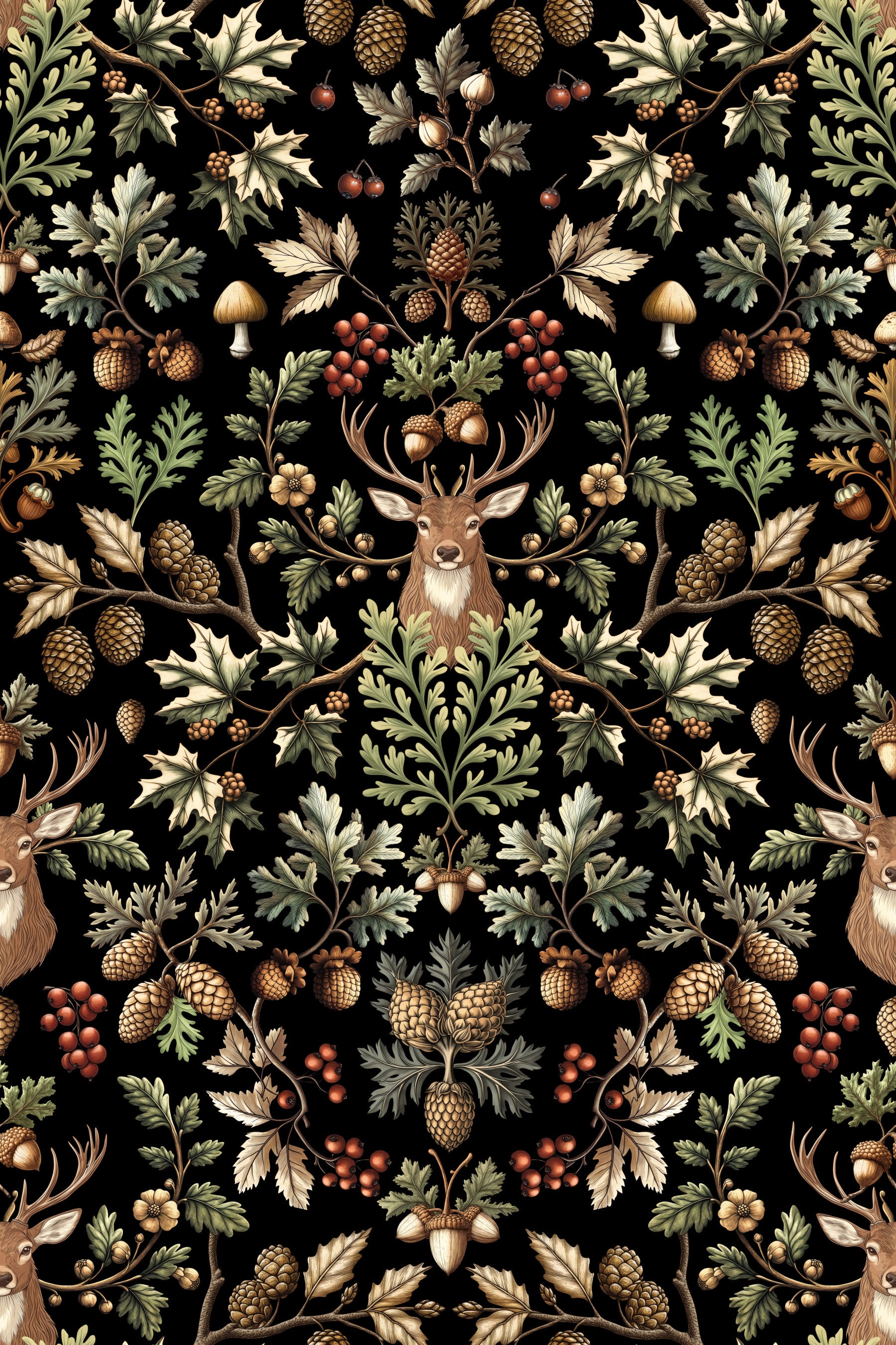Decorative symmetrical woodland pattern inspired by William Morris featuring a rustic design with deer, mushrooms, foliage, acorns and pine cones, perfect for wildlife lovers as a cozy wallpaper for your cabin at the lake or a seasonal decor for your town house. Also a great modern vintage decoration for a rustic hotel room, countryside restaurant, library or unique boutique