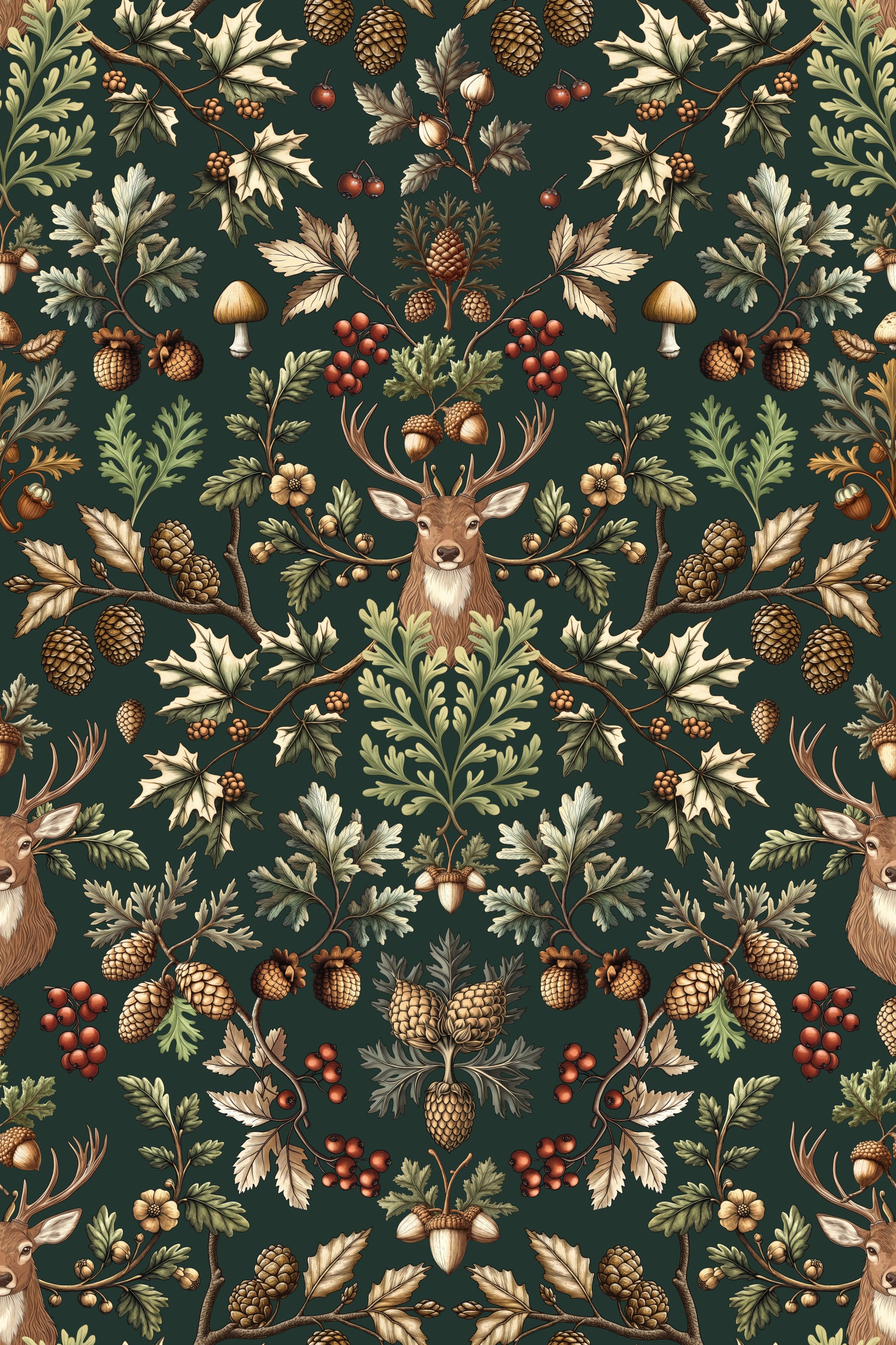 Decorative symmetrical woodland pattern inspired by William Morris featuring a rustic design with deer, mushrooms, foliage, acorns and pine cones, perfect for wildlife lovers to decorate a seasonal home, a rustic cabin or a cozy country hotel room