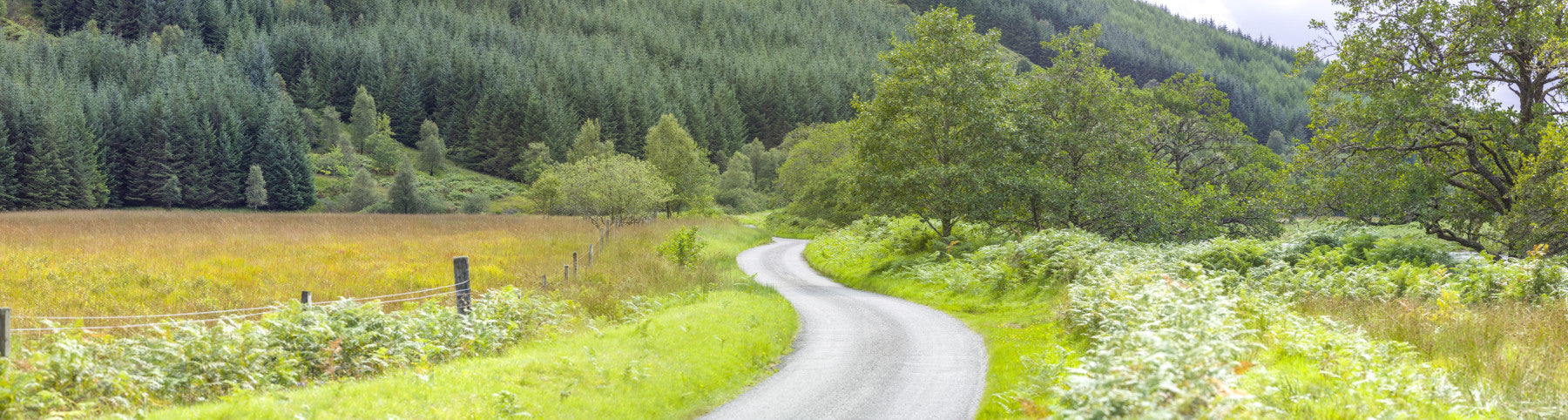 Outdoor mural of a quiet asphalt road amid vibrant Scottish scenery. Serenity decor.