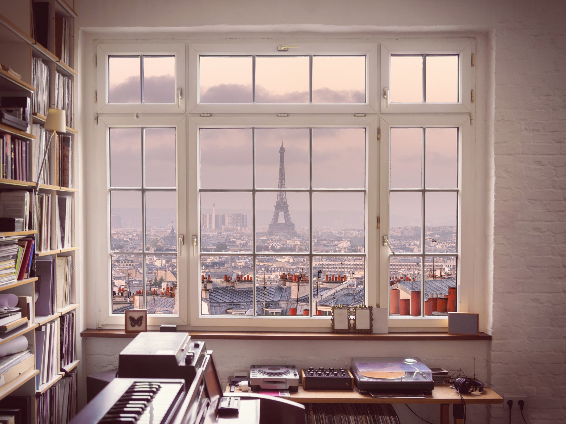 Window to Paris wallpaper mural highlights keyboard and records by window.