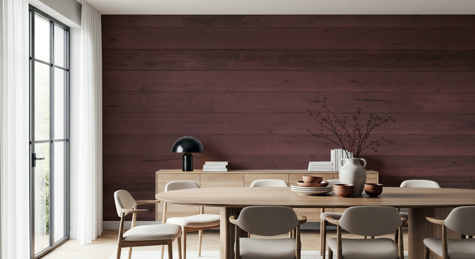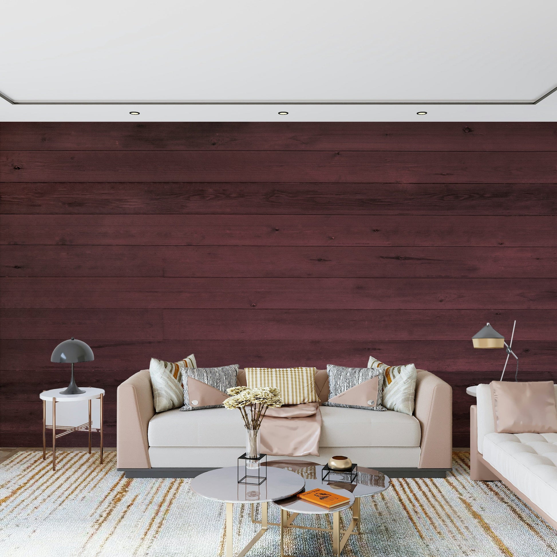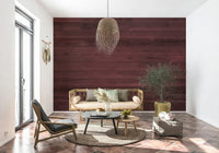 Introduce rustic elegance with this wine-stained wood plank wallpaper. The deep burgundy hue creates a warm, inviting atmosphere in any room. The horizontal plank design adds depth and texture. Elevate your living room, bedroom, or dining space with this refined, rustic touch. This wallpaper for walls integrates seamlessly with contemporary or farmhouse designs, enhancing your home with its rich colour and wood grain detail.