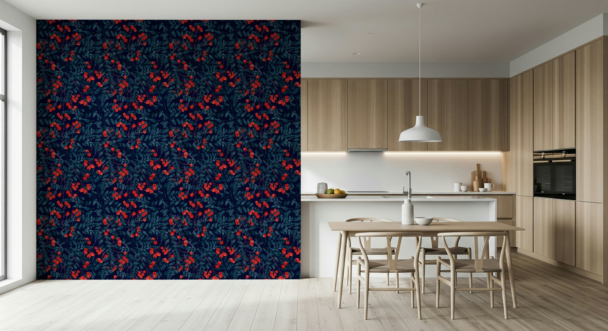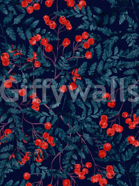 Bring the beauty of winter indoors with this sophisticated botanical wallpaper for walls. Dark teal foliage contrasts beautifully against the bright red berries, creating a rich and inviting pattern. The watercolour style provides a soft, artistic touch that will elevate any room. Consider this design for your living room, dining room, or bedroom to create a cosy and stylish space. It brings a touch of nature and elegance to your home. The intricate detail enhances and complements interior spaces, adding depth and dimension.