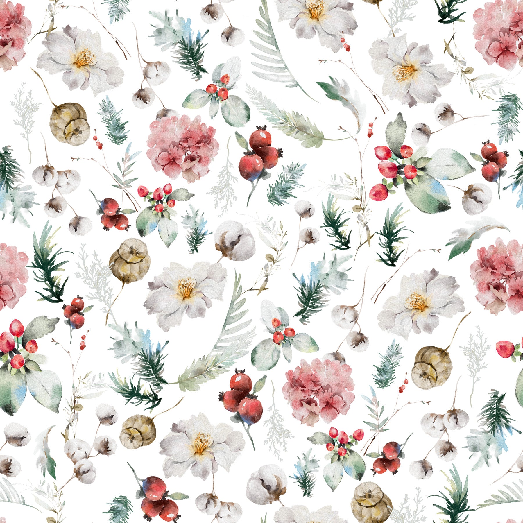 Invite winter's beauty indoors with this delightful floral watercolour design by Uta Naumann. The design features delicate white flowers, blush pink hydrangeas, sprigs of evergreen, and clusters of red berries on a clean white backdrop. Soft brushstrokes and watercolour textures create a serene mood, great for your bedroom, living room, or hallway. This wallpaper for walls brings a refreshing touch of nature to any room. Its calming palette and botanical pattern enhance interiors with a peaceful, sophisticated vibe, perfect for scandinavian style. This wallpaper offers a subtle nod to festive cheer.
