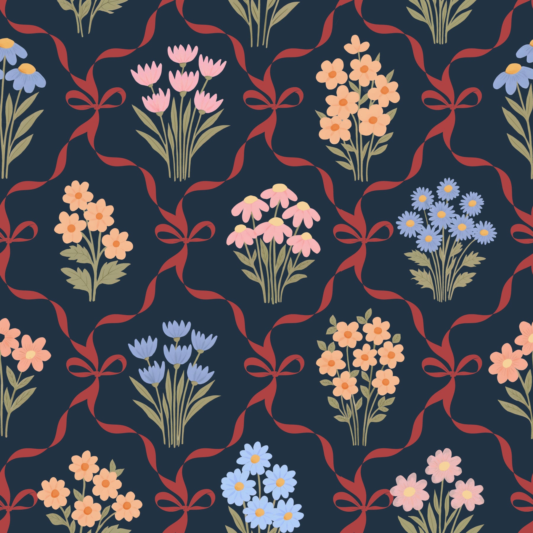Embrace the cozy charm of winter with this enchanting cottagecore wallpaper. "Winter Cottagecore Floral Bouquet" features a delightful array of hand-drawn floral bouquets in gentle hues of peach, blush pink, and powder blue, set against a deep navy backdrop. Each bouquet is lovingly tied with a delicate burgundy ribbon, adding a touch of festive warmth. This wallpaper evokes a sense of nostalgia and the simple pleasures of a winter spent indoors, surrounded by natural beauty. Perfect for adding a touch of rustic elegance to any screen.