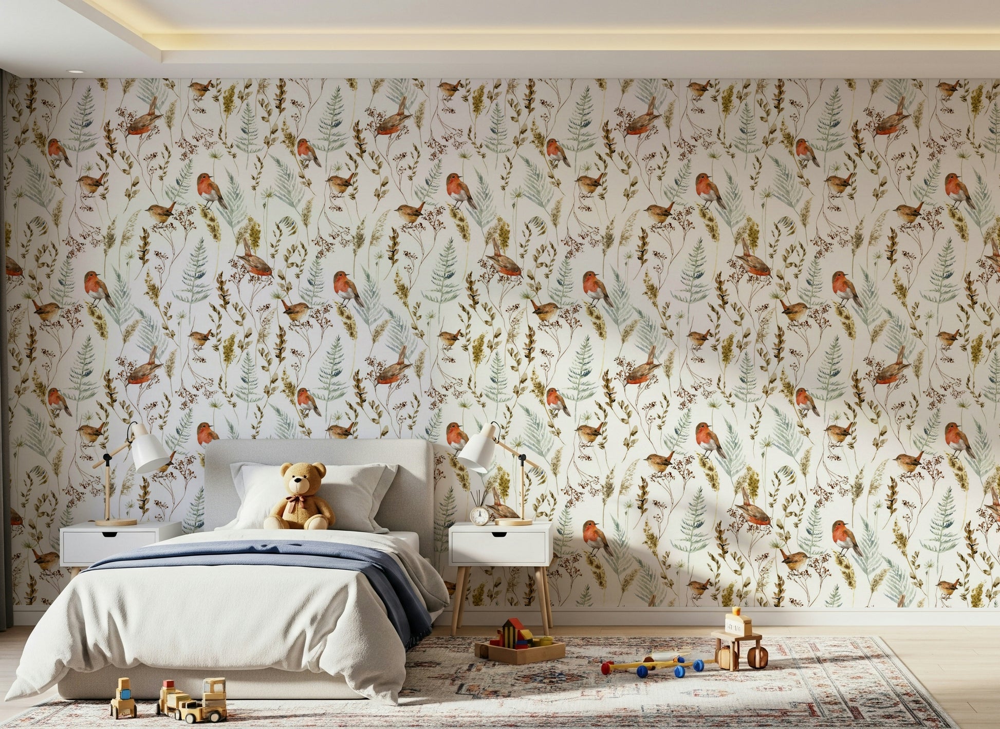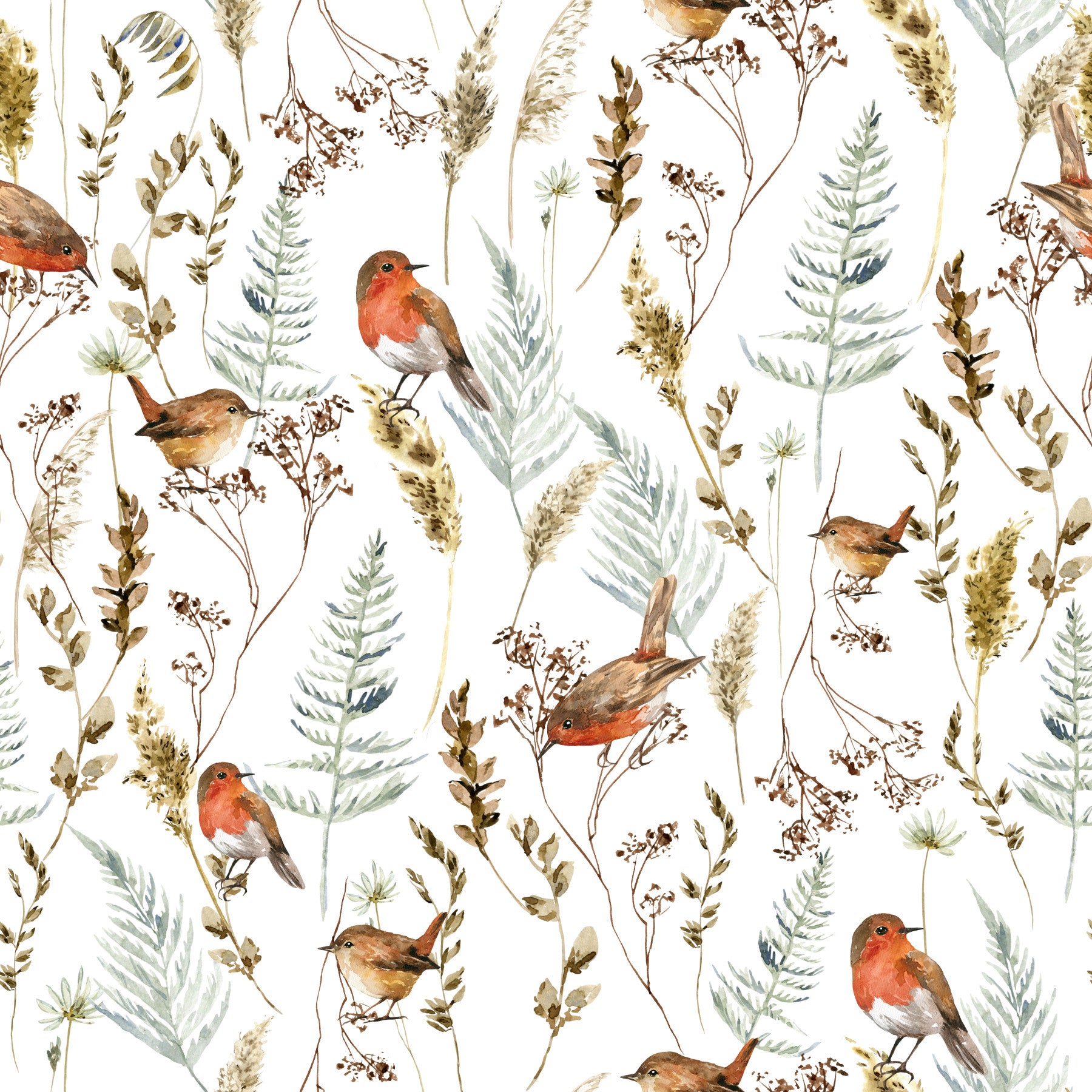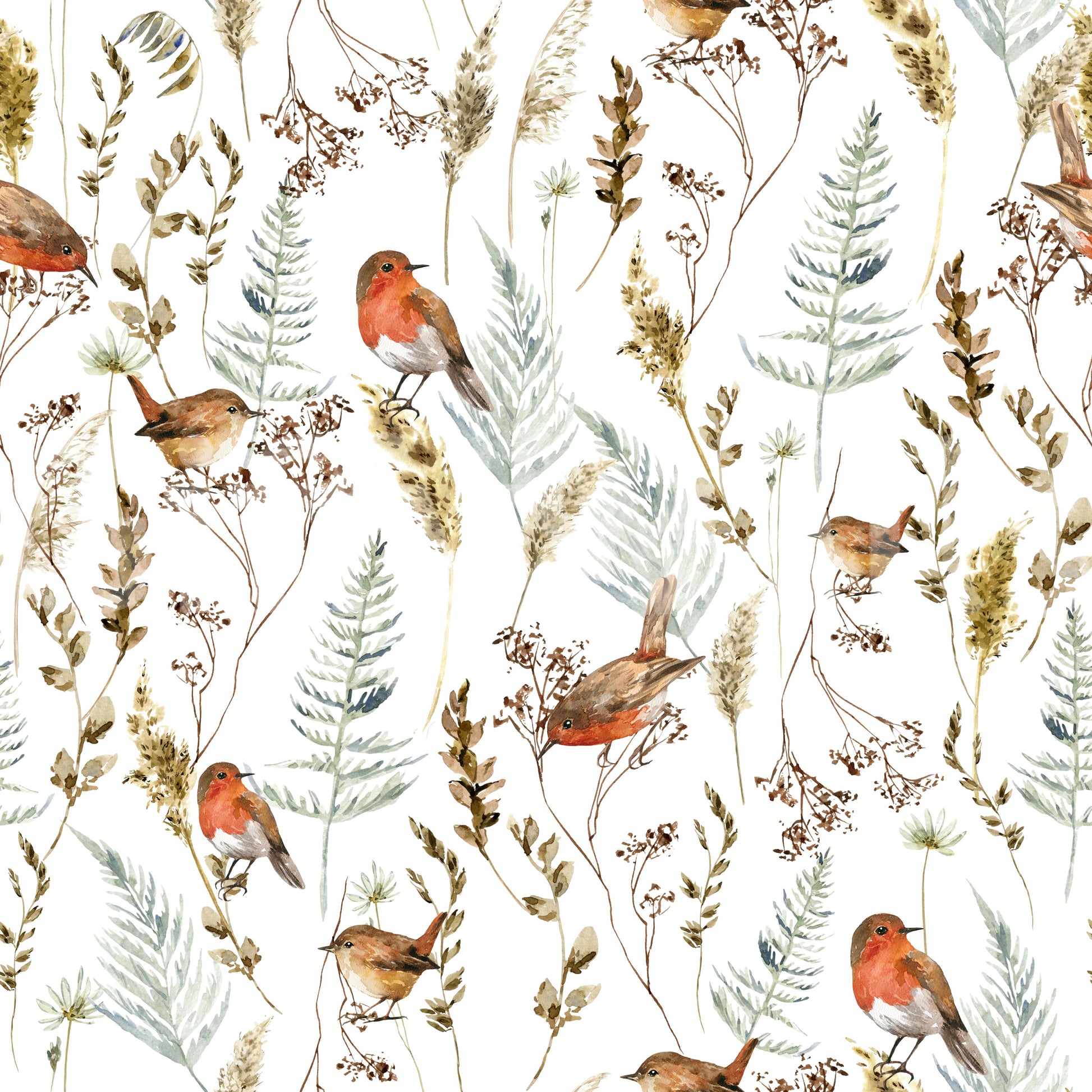 Bring a touch of winter's quiet beauty into your home with this enchanting wallpaper by Uta Naumann. A soft, watercolour design features charming robins perched among delicate foliage in muted browns and greens. The gentle brushstrokes and natural elements create a serene, calming effect, perfect for a bedroom or living room. Install this wallpaper for walls to instantly refresh your space with a touch of nature's elegance. This design offers a subtle yet sophisticated style that complements a wide variety of interior decor, from modern farmhouse to classic styles. It invites warmth and tranquility into your everyday life.