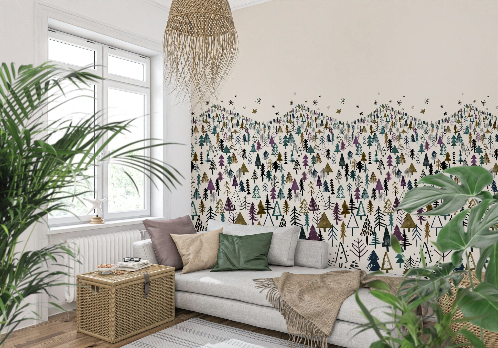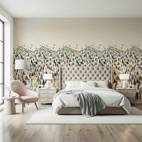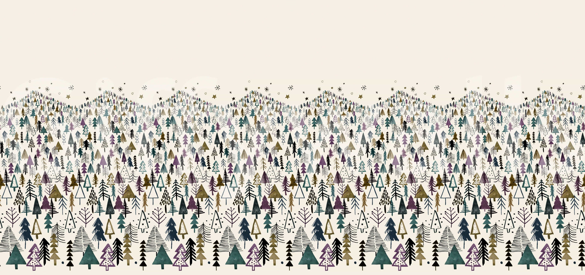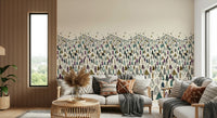 Welcome a serene winter wonderland into your home with this unique tree-themed wallpaper. Ideal as wallpaper for walls, it showcases a dense forest of stylized trees in a palette of muted greens, purples, and browns against a creamy backdrop. The whimsical design captures a childlike sense of wonder, making it a charming addition to kids' rooms, nurseries, or playrooms. Its detailed illustration style adds a touch of artistry, while the soft hues create a calming ambiance. This design enhances interior spaces by introducing a playful element with a clean, understated aesthetic. It complements both modern and traditional décor.