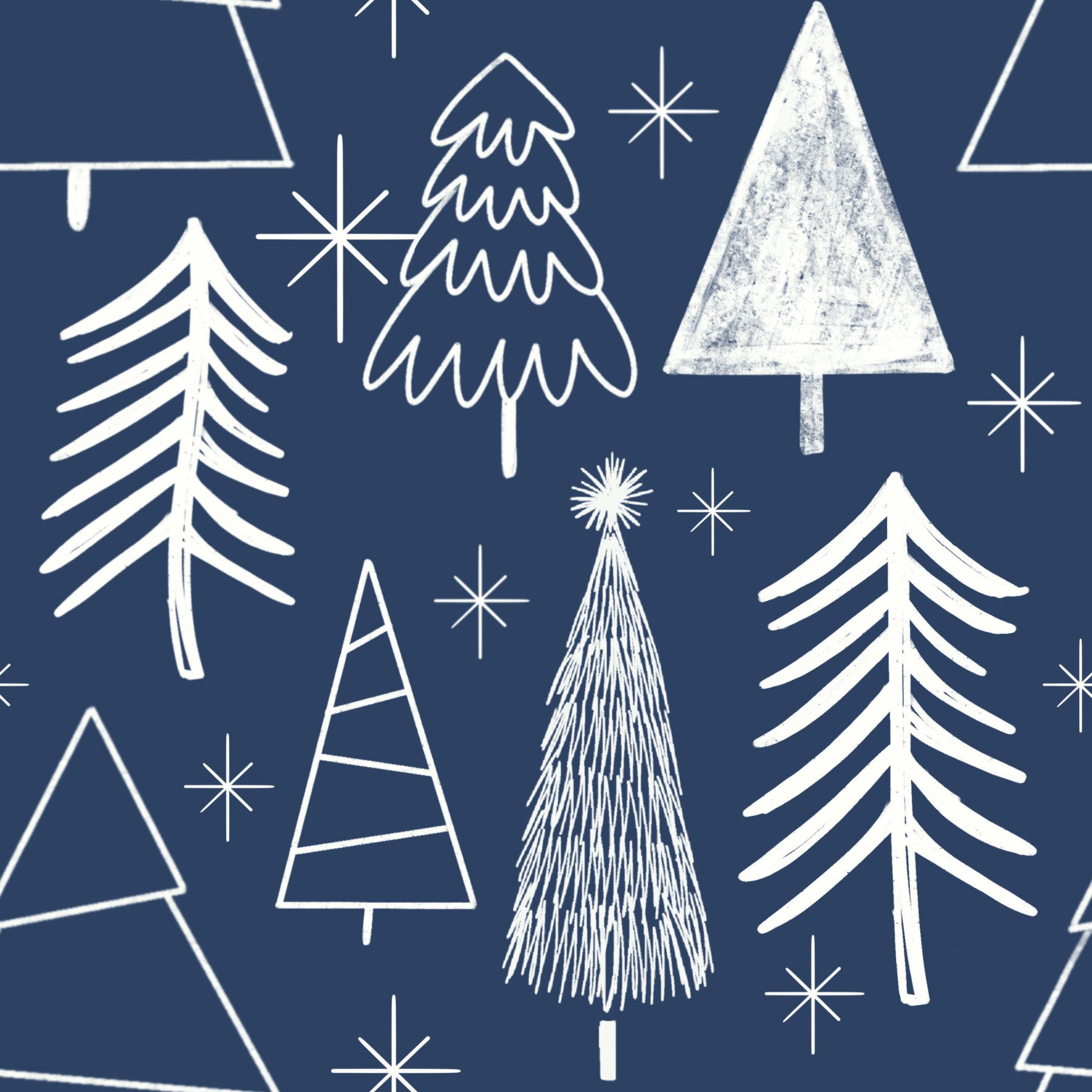 A navy holiday wallpaper featuring whimsical tree doodles and tiny star details.