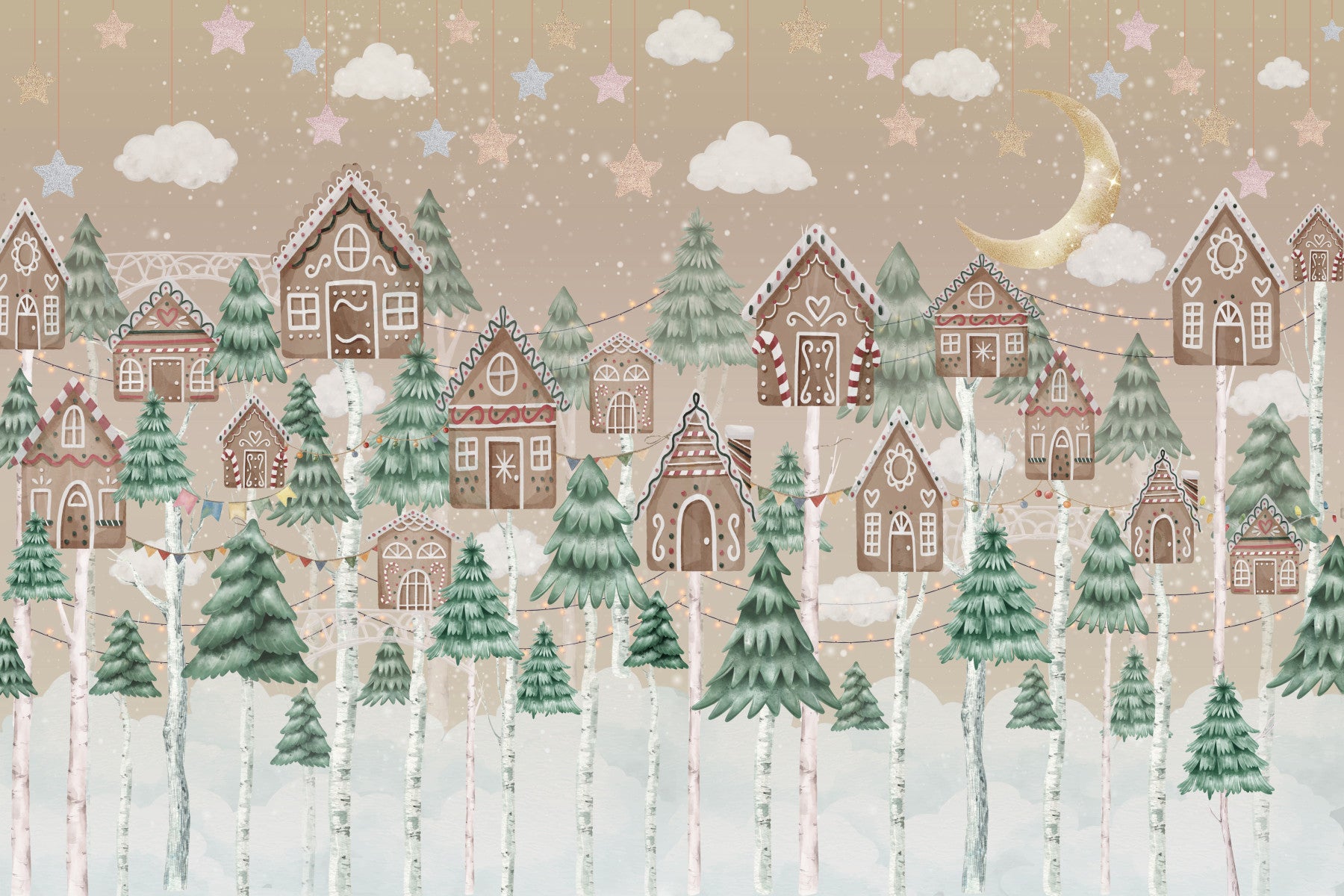 Transform your room with this enchanting design! Adorable gingerbread houses peek through a forest of Christmas trees under a starry night sky, all rendered in a soft, comforting palette. This charming wallpaper for walls brings a festive, storybook feel to any room. It's perfect for creating a cosy reading nook or a magical kids room. Let this delightful scene complement your interior décor with sweetness and light.