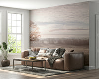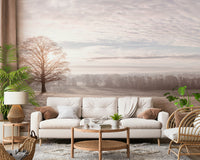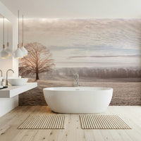 Trees in meadow. Capture the serene beauty of a winter landscape with this panoramic view. A lone tree stands in a field, dusted with frost, whilst soft light filters through the sky. The design brings a calming presence into any space, promoting a sense of peace. This wallpaper for walls introduces natural elements without overwhelming a room. Ideal for living rooms, bedrooms, or offices, it creates a relaxing backdrop. The neutral colour palette makes it a perfect choice for Scandinavian or minimalist interiors.