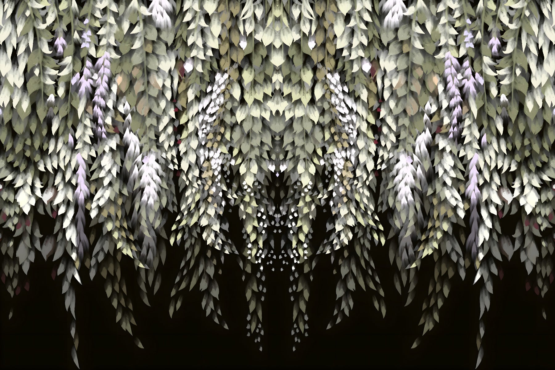 Dramatic wisteria mural with cascading greenery on dark backdrop