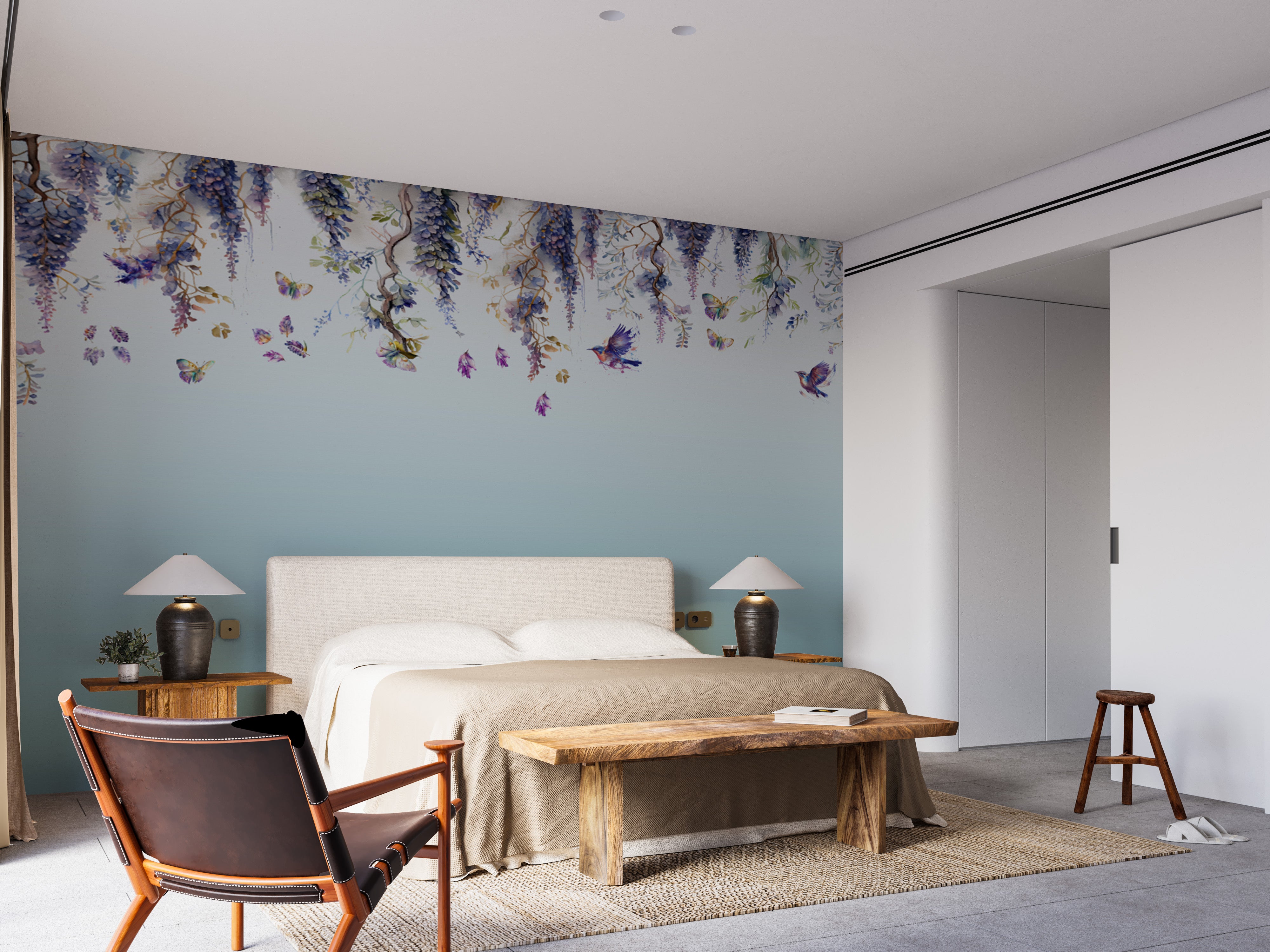 Wisteria romance blue mural wallpaper for a dreamy, tranquil atmosphere.